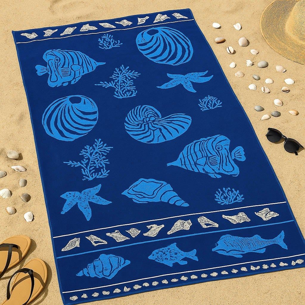 Velká plážová osuška s motivem ryb a mušlí v modré nejen na pláž, k vodě nebo k bazénu. Osuška je vyrobena z kvalitní 100% bavlny s vysokou gramáží.Rozměrná plážová osuška vhodná nejen pro dospělé. Využití najde na pláži u moře, u vody v přírodě i u bazénu. Osuška je velice hebká a příjemná na dotek díky použití kvalitního materiálu (100%bavlna) a vysoké gramáži. Osuška si tak udrží vlastnosti a barevnou stálost i po mnoha vypráních. Z jedné strany má klasickou froté smyčku, z druhé pak jemně střižený velur. Osušku doporučujeme prát na 60°C bez aviváže aby se dosáhlo stálé savosti osušky. Osuška se nežehlí.
