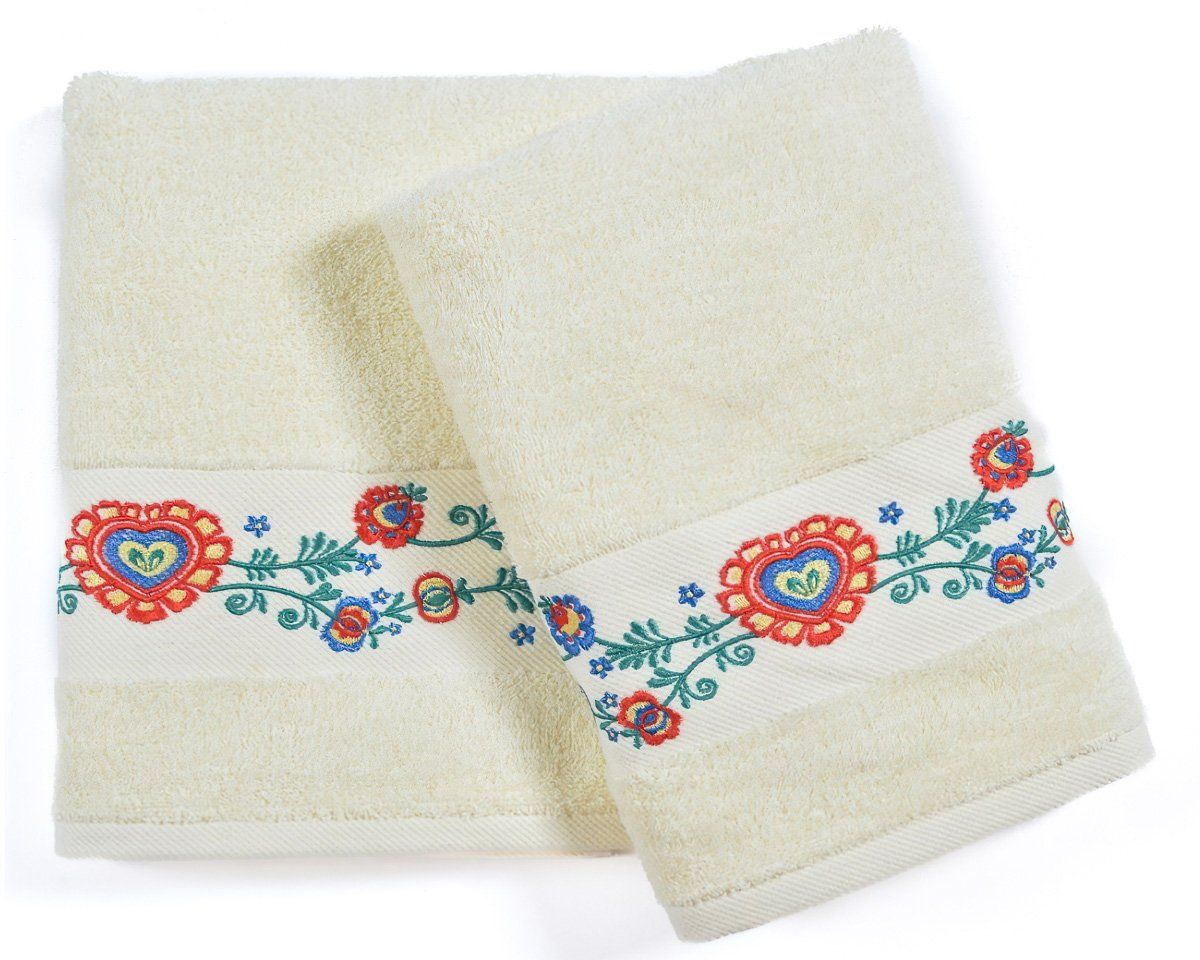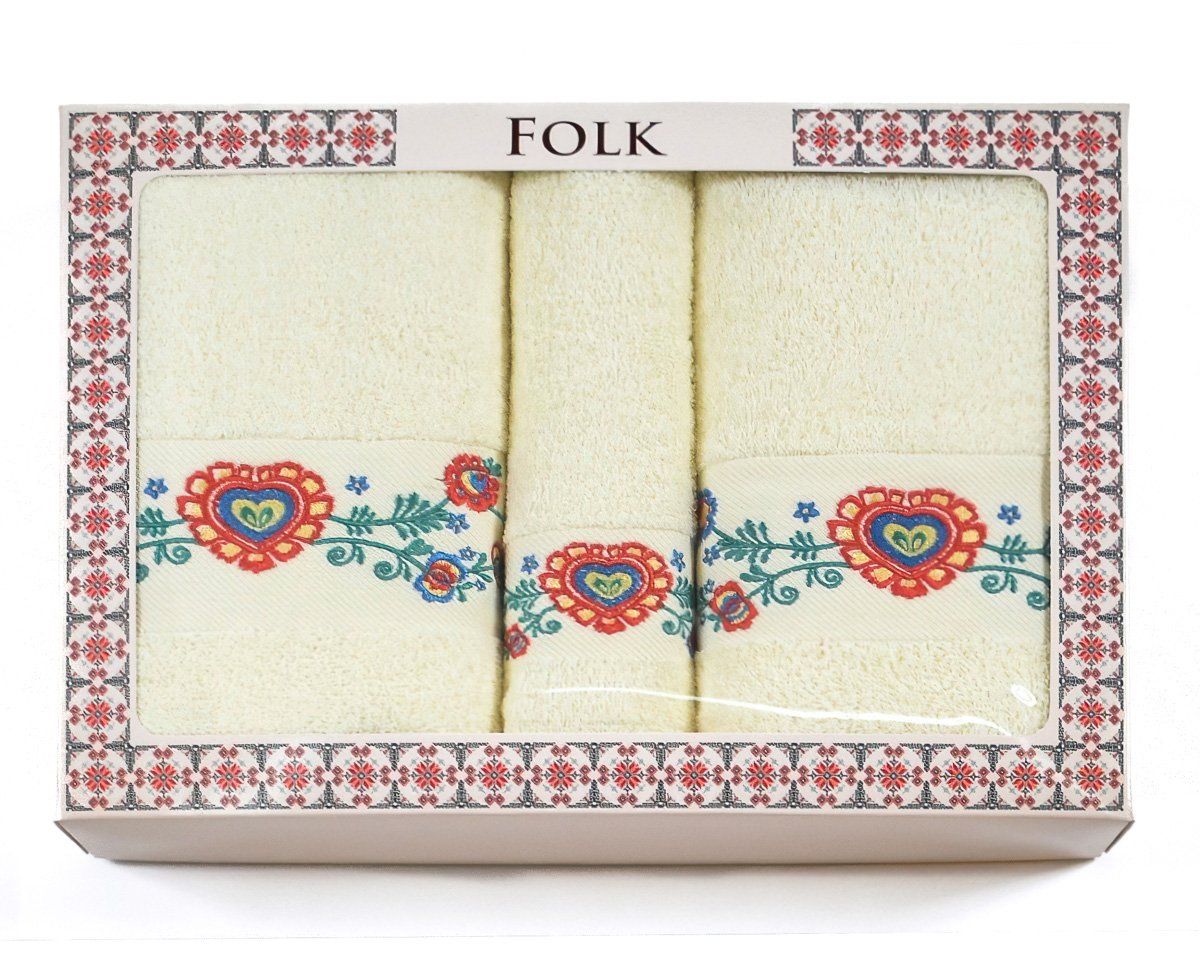 Dárkový set froté ručníků (1x 30x50cm, 1x 50x100cm) a osušek (1x 70x140cm) s vyšívaným folklórním vzorem na světle žlutém podkladu. Ručníky jsou vyrobeny z vysoce kvalitní 100% bavlny s vysokou gramáží, díky čemuž jsou velmi hebké, savé a mají nadýchaný vzhled. Vyrobeny jsou v gramáži 450g/m2. Dodáváno v dárkovém, krabicovém balení.Froté ručníky a osušky se stanou ozdobou každé koupelny. Osušky a ručníky jsou vyrobeny ze 100% bavlny s vysokou gramáží, díky čemuž jsou velice savé, hebké a příjemné na dotek. Udrží si vlastnosti a barevnou stálost i po mnoha vypráních. Osušky a ručníky doporučujeme prát na 40°C bez aviváže aby se dosáhlo stálé savosti. Žehlení max. 150°C.