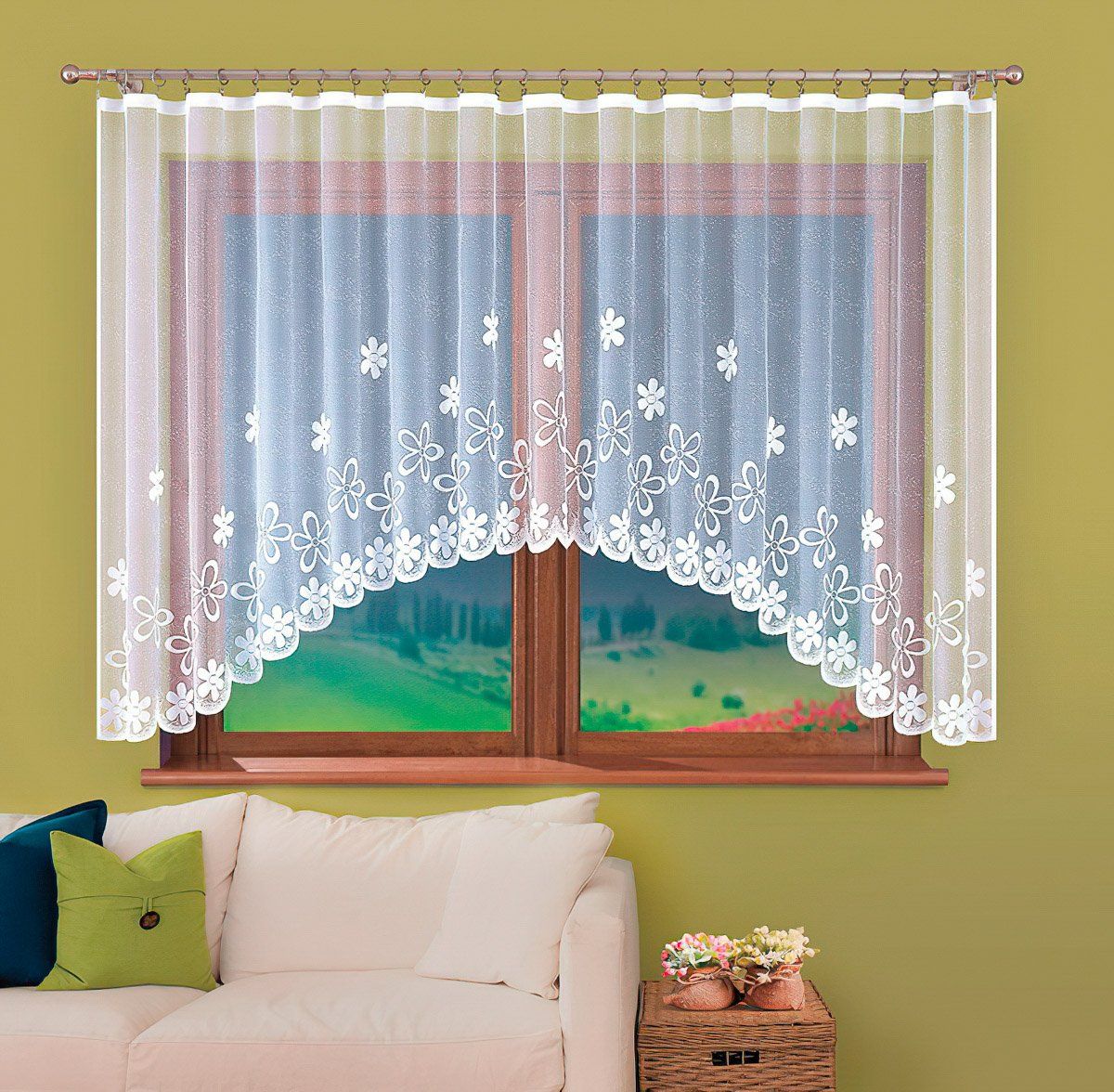 Hotová jemná žakárová záclona se vzorem kytiček v jednobarevné bílé barvě. Záclona je vyrobena ze 100% polyesteru v různých výškách a šířkách. Záclona má z výroby pevné boční i horní okraje, bez řasící stužky. Výška záclony je měřena v nejdelším místě.