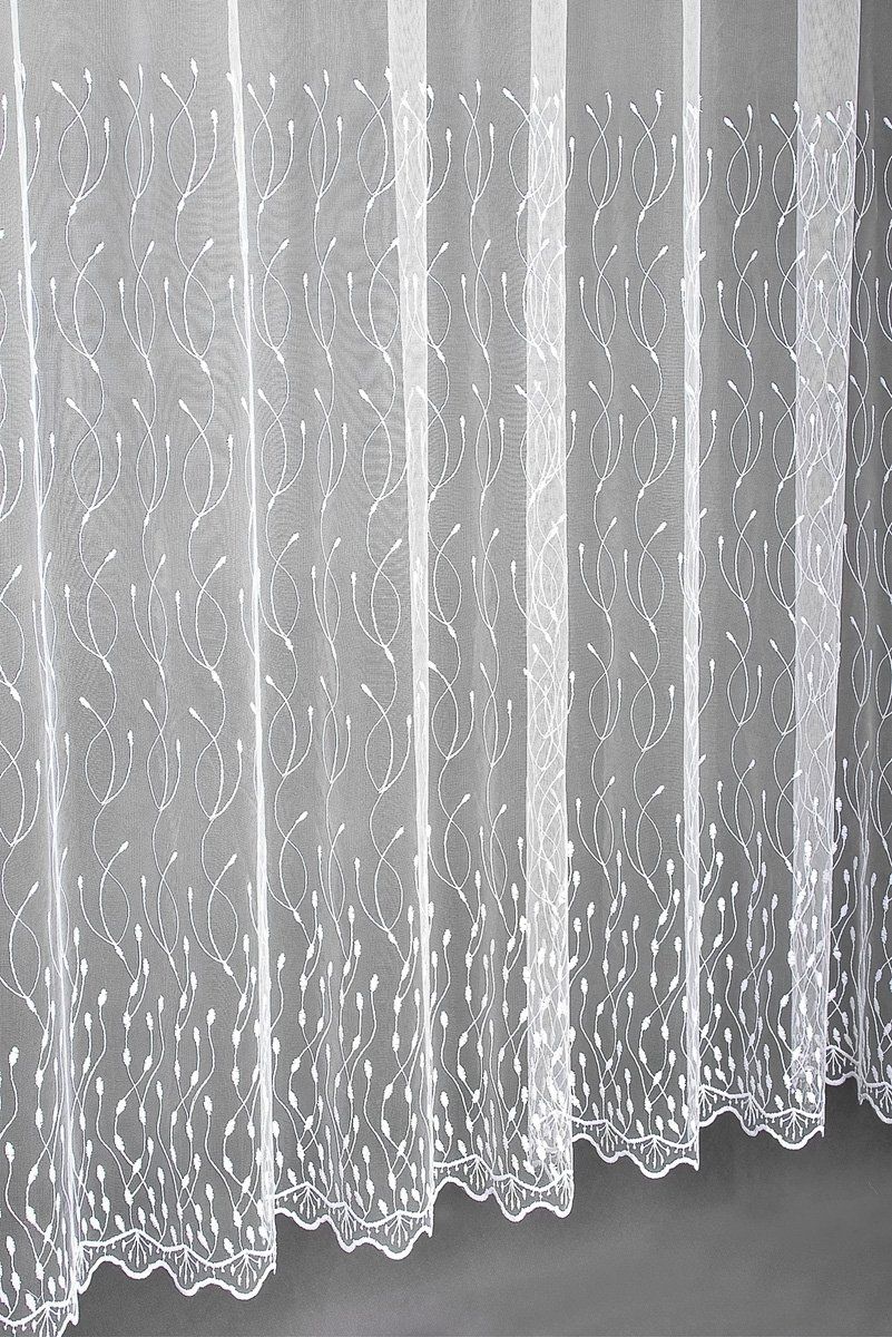 Tylová metrážová záclona se vzorem vyšívaných ornamentů v bílé barvě, zakončená bordurou. Záclona je vyrobena ze 100% polyesteru a je dostupná v různých výškách. Výška záclony je měřena v nejdelším místě. Šířku záclony zadejte do kolonky "Množství"