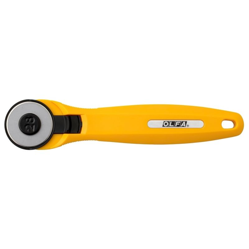 Rotační kruhový řezač japonské, vysoce kvalitní značky OLFA nejen na látky a patchwork s rovnou čepelí o průměru 28 mm. Kruhový řezač umožňuje komfortní a přesné řezání látek i ve více vrstvách. Rukojeť je vhodná pro leváky i praváky. Samozřejmostí je výsuvná bezpečnostní ochrana čepele, která je ostrá jako břitva a je vyměnitelná. Hravě tak zvládne řezat i tvrdší materiály, jako papír, kartony apod. Pro dlouhou životnost použijte kvalitní řezací podložku a pro nejvyšší přesnost nezapomeňte použít řezací pravítko.