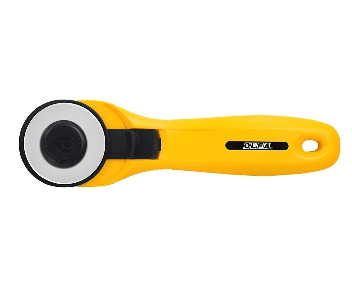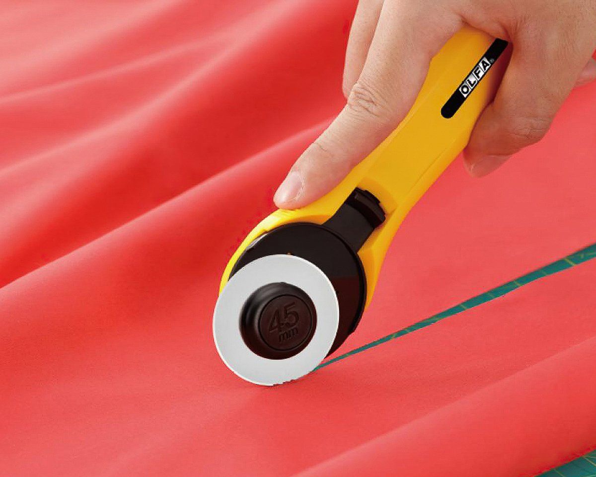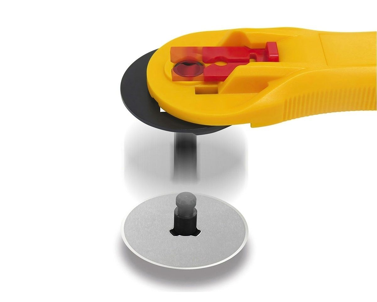 Rotační kruhový řezač japonské, vysoce kvalitní značky OLFA nejen na látky a patchwork s rovnou čepelí o průměru 45 mm. Kruhový řezač umožňuje komfortní a přesné řezání látek i ve více vrstvách. Rukojeť je vhodná pro leváky i praváky. Samozřejmostí je výsuvná bezpečnostní ochrana čepele, která je ostrá jako břitva a je vyměnitelná. Hravě tak zvládne řezat i tvrdší materiály, jako papír, kartony apod. Pro dlouhou životnost použijte kvalitní řezací podložku a pro nejvyšší přesnost nezapomeňte použít řezací pravítko.