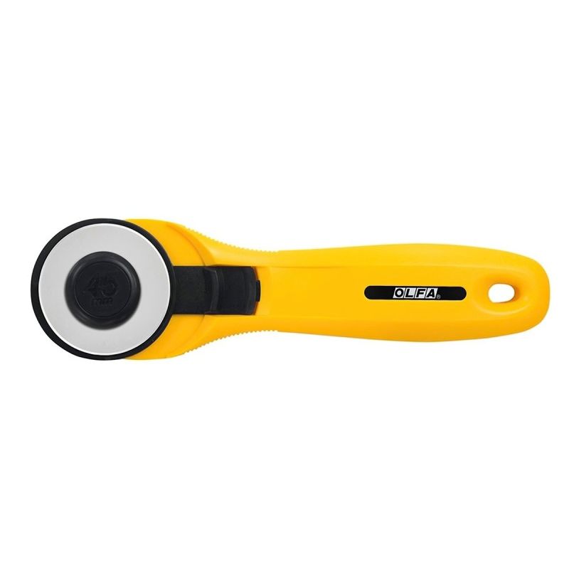 Rotační kruhový řezač japonské, vysoce kvalitní značky OLFA nejen na látky a patchwork s rovnou čepelí o průměru 45 mm. Kruhový řezač umožňuje komfortní a přesné řezání látek i ve více vrstvách. Rukojeť je vhodná pro leváky i praváky. Samozřejmostí je výsuvná bezpečnostní ochrana čepele, která je ostrá jako břitva a je vyměnitelná. Hravě tak zvládne řezat i tvrdší materiály, jako papír, kartony apod. Pro dlouhou životnost použijte kvalitní řezací podložku a pro nejvyšší přesnost nezapomeňte použít řezací pravítko.