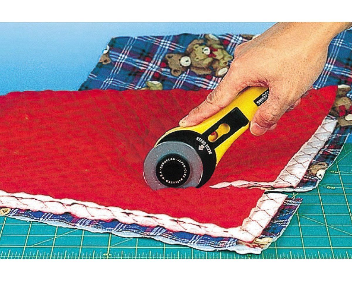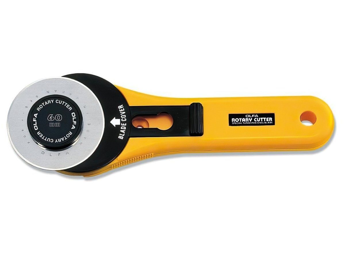 Rotační kruhový řezač japonské, vysoce kvalitní značky OLFA nejen na látky a patchwork s rovnou čepelí o průměru 60 mm. Kruhový řezač umožňuje komfortní a přesné řezání látek i ve více vrstvách. Rukojeť je vhodná pro leváky i praváky. Samozřejmostí je výsuvná bezpečnostní ochrana čepele, která je ostrá jako břitva a je vyměnitelná. Hravě tak zvládne řezat i tvrdší materiály, jako papír, kartony apod. Pro dlouhou životnost použijte kvalitní řezací podložku a pro nejvyšší přesnost nezapomeňte použít řezací pravítko.