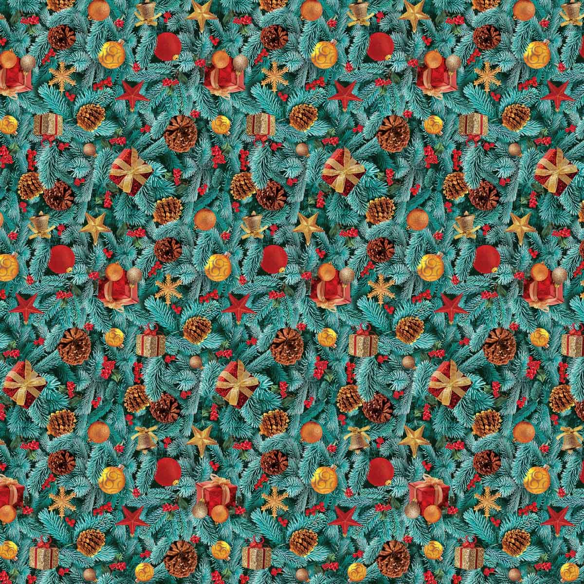 Omyvatelná PVC ubrusovina s podkladem z netkané textilie se vzorem dárků, baněk a šišek na podkladě tvořeným ze smrkových větviček s hladkým povrchem. Ubrus je dostupný v metráži o šířce 140cm.