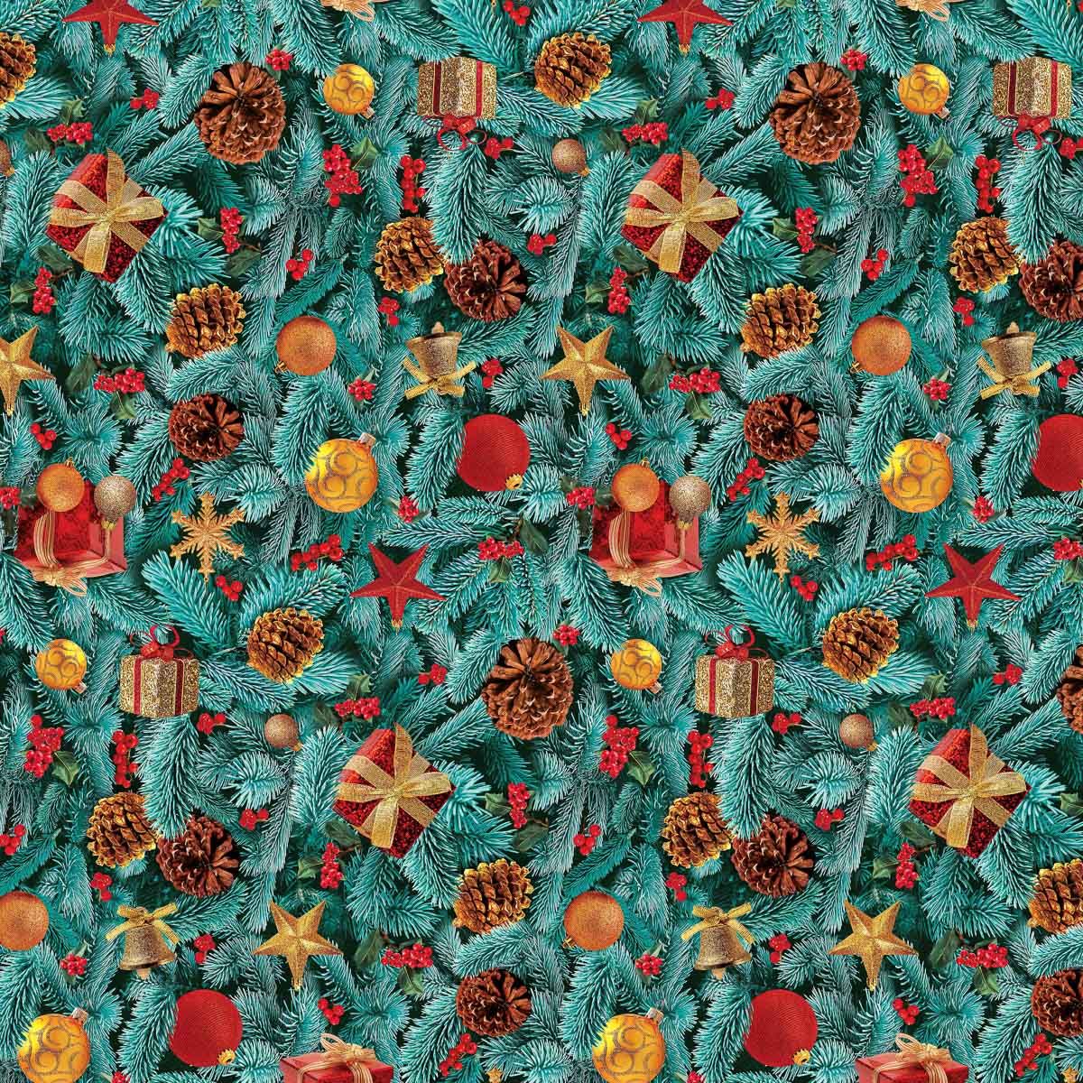 Omyvatelná PVC ubrusovina s podkladem z netkané textilie se vzorem dárků, baněk a šišek na podkladě tvořeným ze smrkovýc...