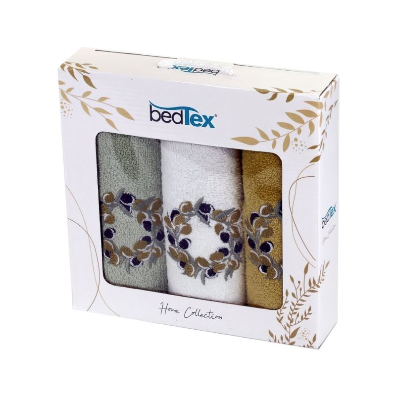 Dárkový set froté ručníků OLIVOVÝ VĚNEČEK, zelený s výšivkou, 30x50cm, 3ks