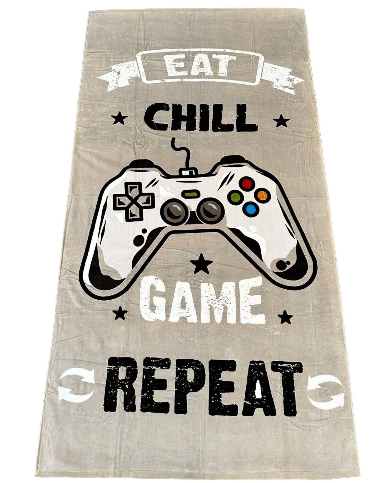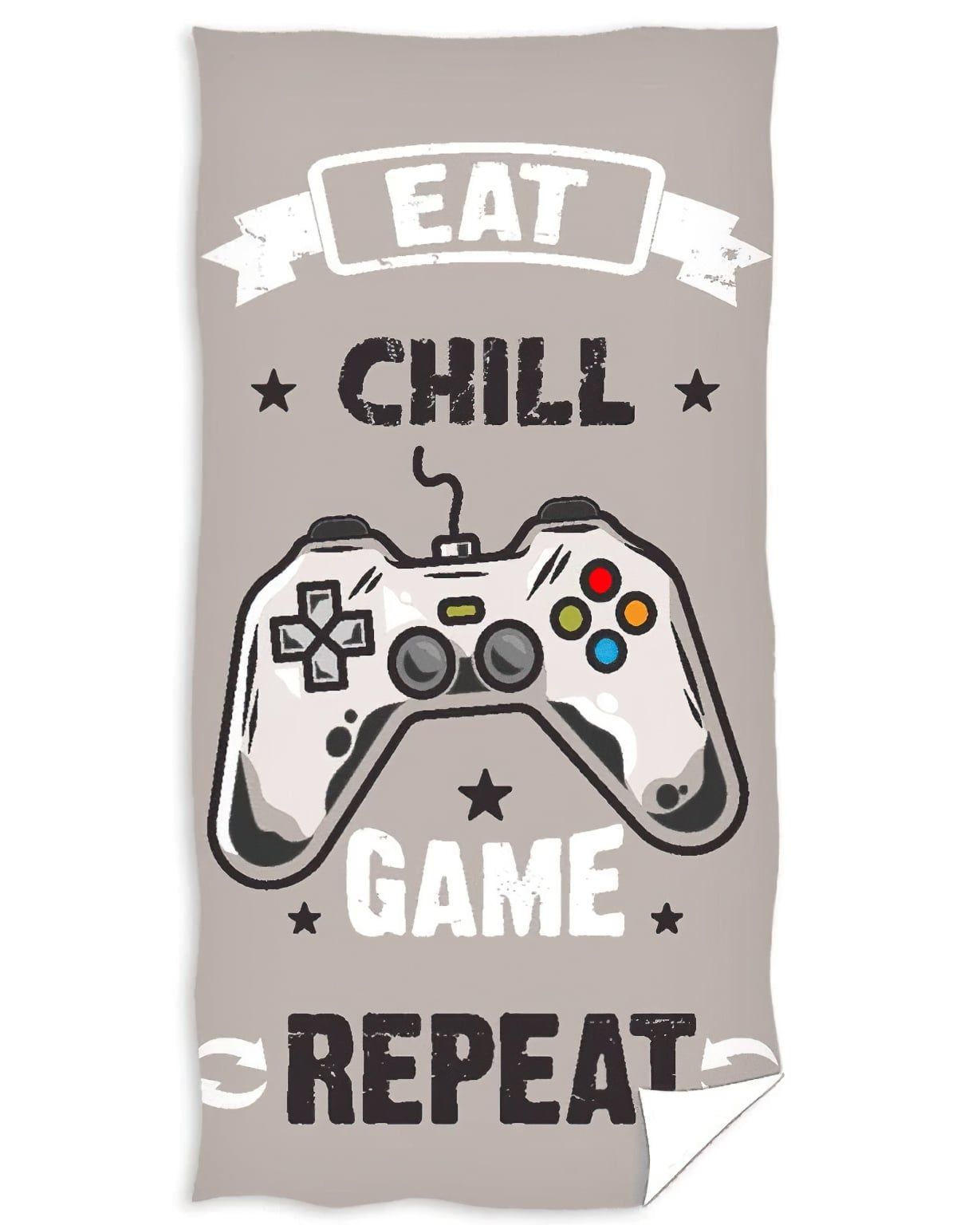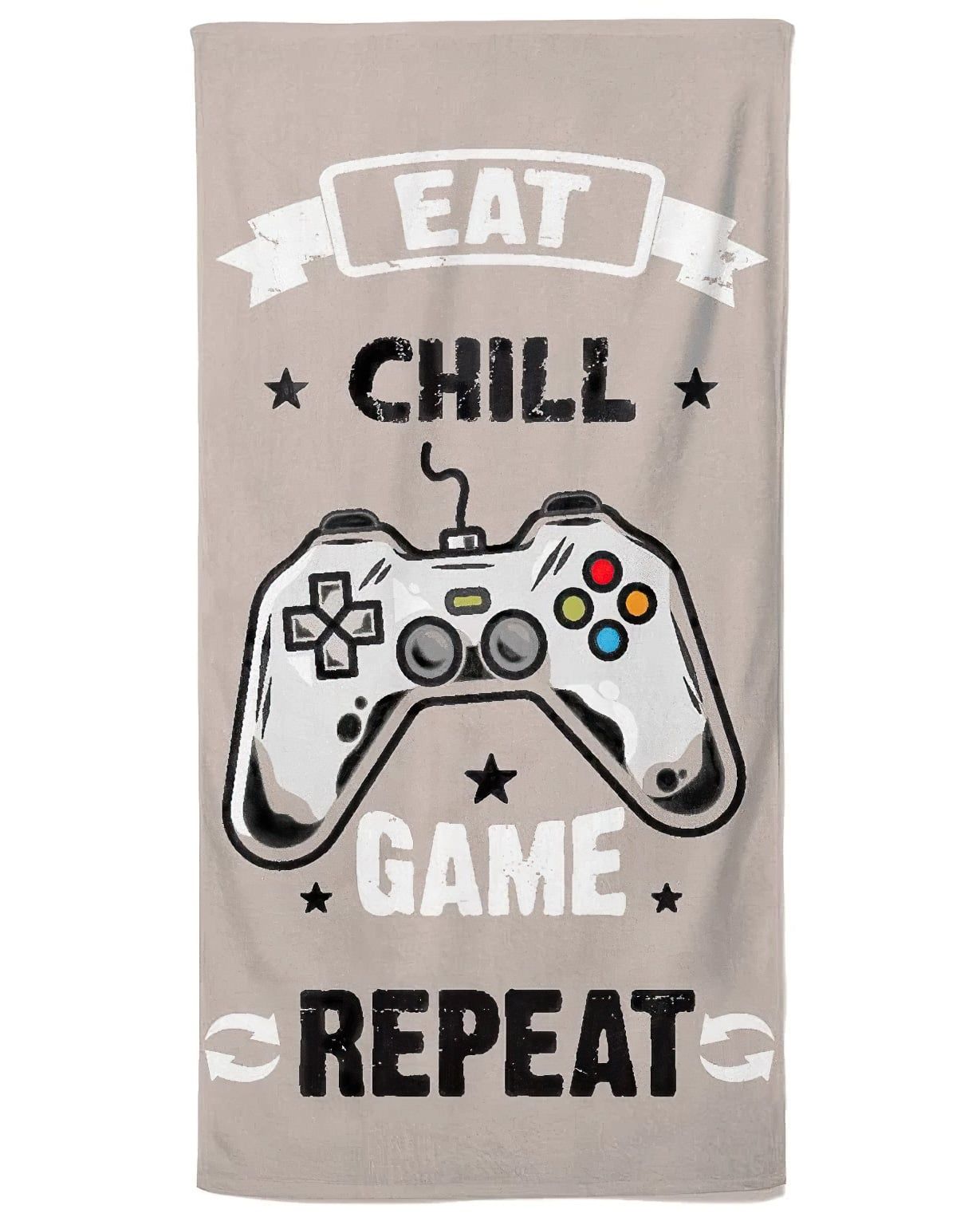 Dětská plážová osuška s motivem velikého herního ovladače a nápisy v béžovo-šedé barvě. Lícní strana osušky je z jemně střiženého froté (velur). Po rubu má jemné froté smyčky bez potisku v bílé barvě. Osuška je vyrobena ze 100% bavlny s gramáží 400g/m2 v rozměru 90 x 180 cm..Dětská osuška s veselým barevným motivem jistě potěší nejen děti. Osuška je velice hebká a příjemná na dotek. Maminky zase ocení vysoce kvalitní materiál (100%bavlna), díky kterému si osuška udrží vlastnosti i po mnoha vypráních. Díky speciální technice tisku je také zaručena barevná stálost. Osušku doporučujeme prát na 30°C bez aviváže, aby se dosáhlo stálé savosti osušky. Žehlení max. na 150°C.