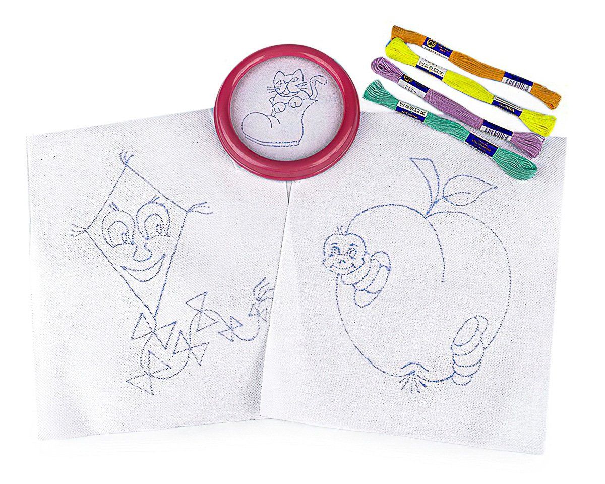 Dětská sada na vyšívání s motivem draka a jablka. Vyšívá se na předtištěnou tkaninu pomocí vyšívacích jehel a přízí mouline (mulinka). Vyšívací sada obsahuje vyšívací tkaninu s předlohou, sadu barevných přízí a kulatý plastový rámeček o průměru 12 cm (vnitřní průměr 9,3 cm) a dvě větší plátna ze 100% bavlny o rozměru 23 x 26 cm s předtištěnými motivy.