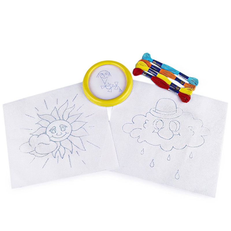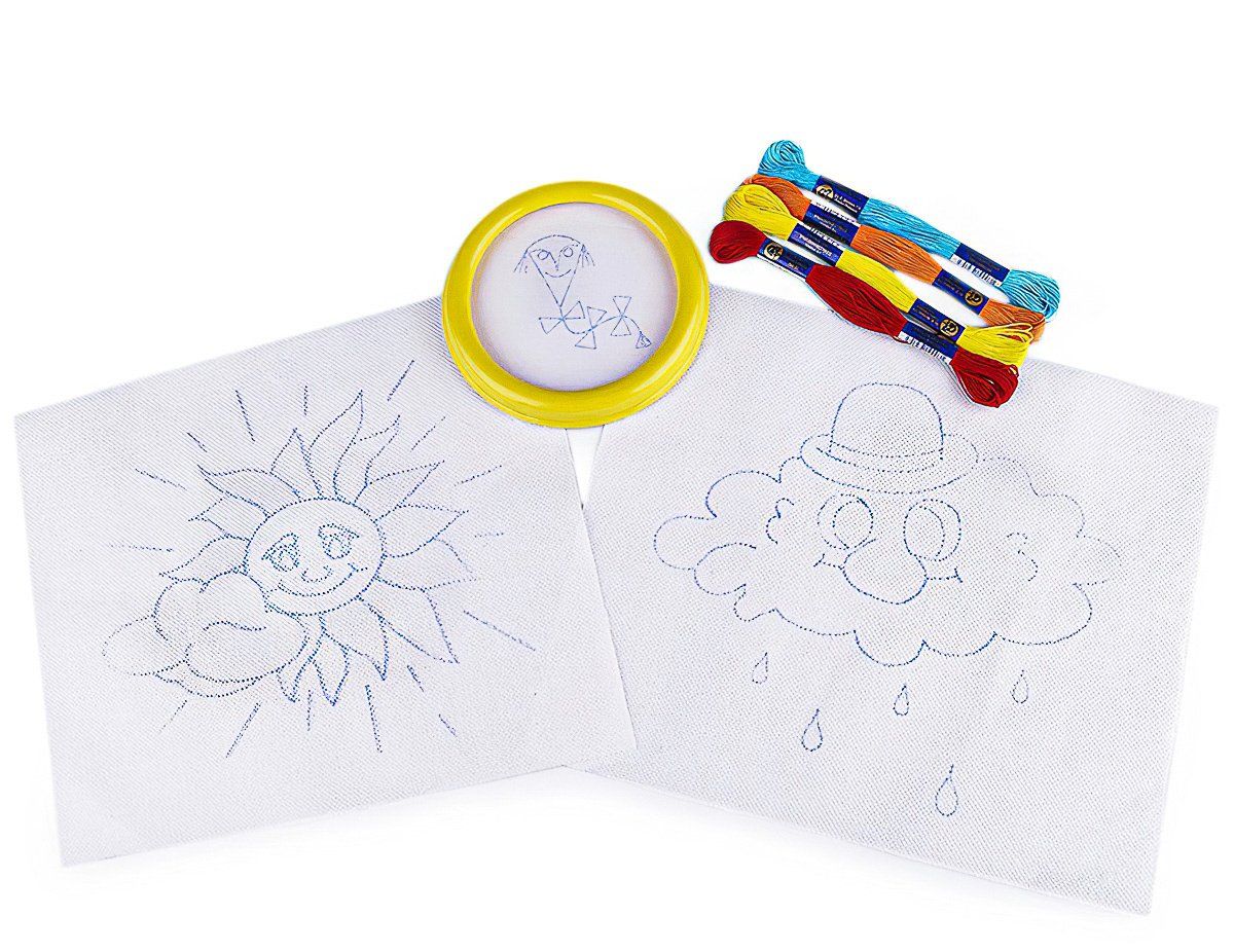 Dětská sada na vyšívání s motivem sluníčka a mráčku. Vyšívá se na předtištěnou tkaninu pomocí vyšívacích jehel a přízí mouline (mulinka). Vyšívací sada obsahuje vyšívací tkaninu s předlohou, sadu barevných přízí a kulatý plastový rámeček o průměru 12 cm (vnitřní průměr 9,3 cm) a dvě větší plátna ze 100% bavlny o rozměru 23 x 26 cm s předtištěnými motivy.