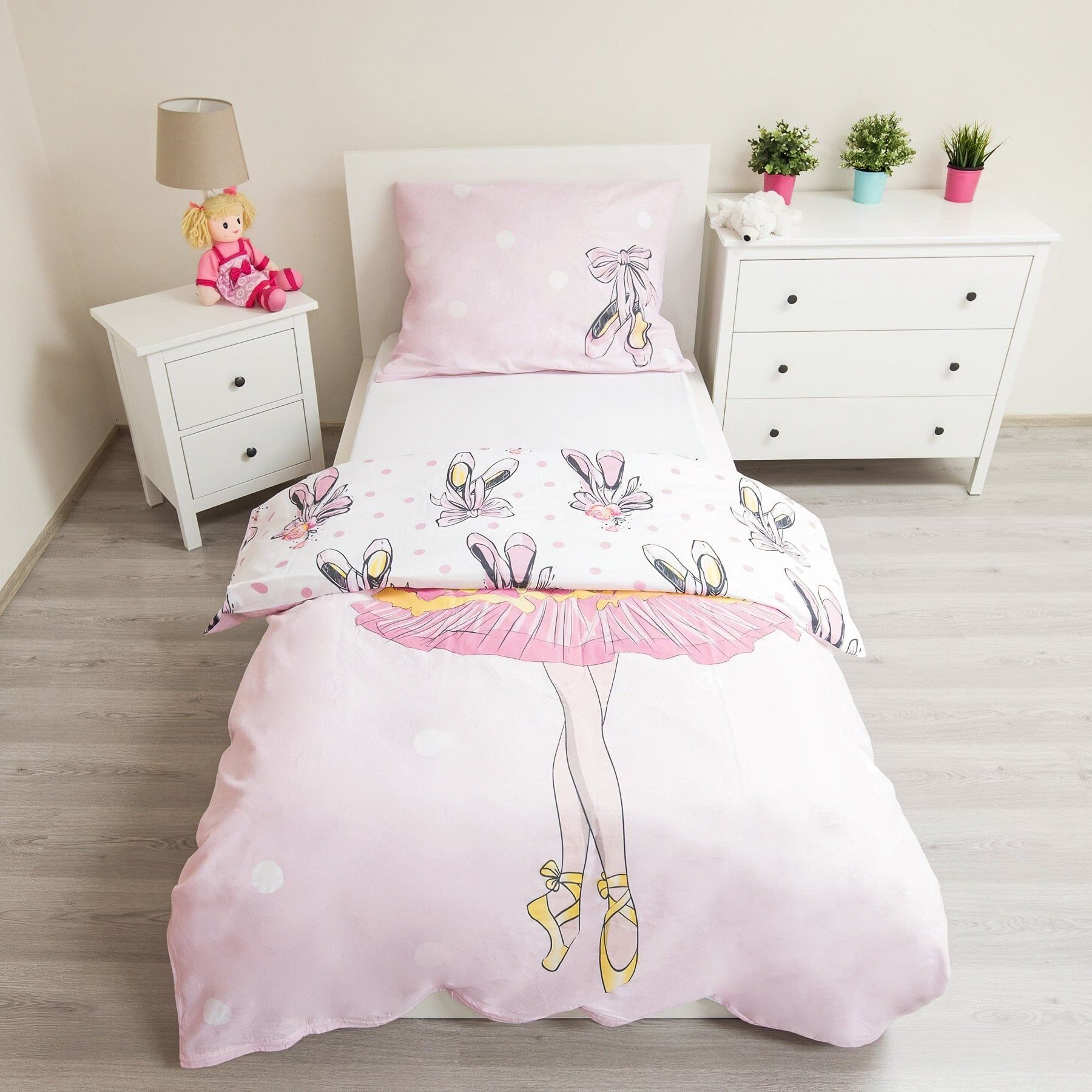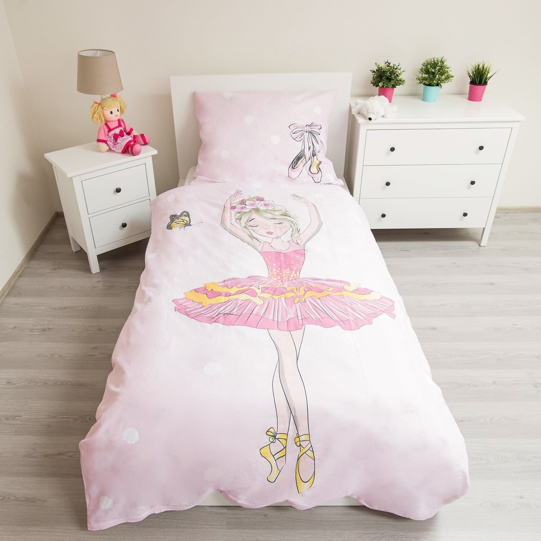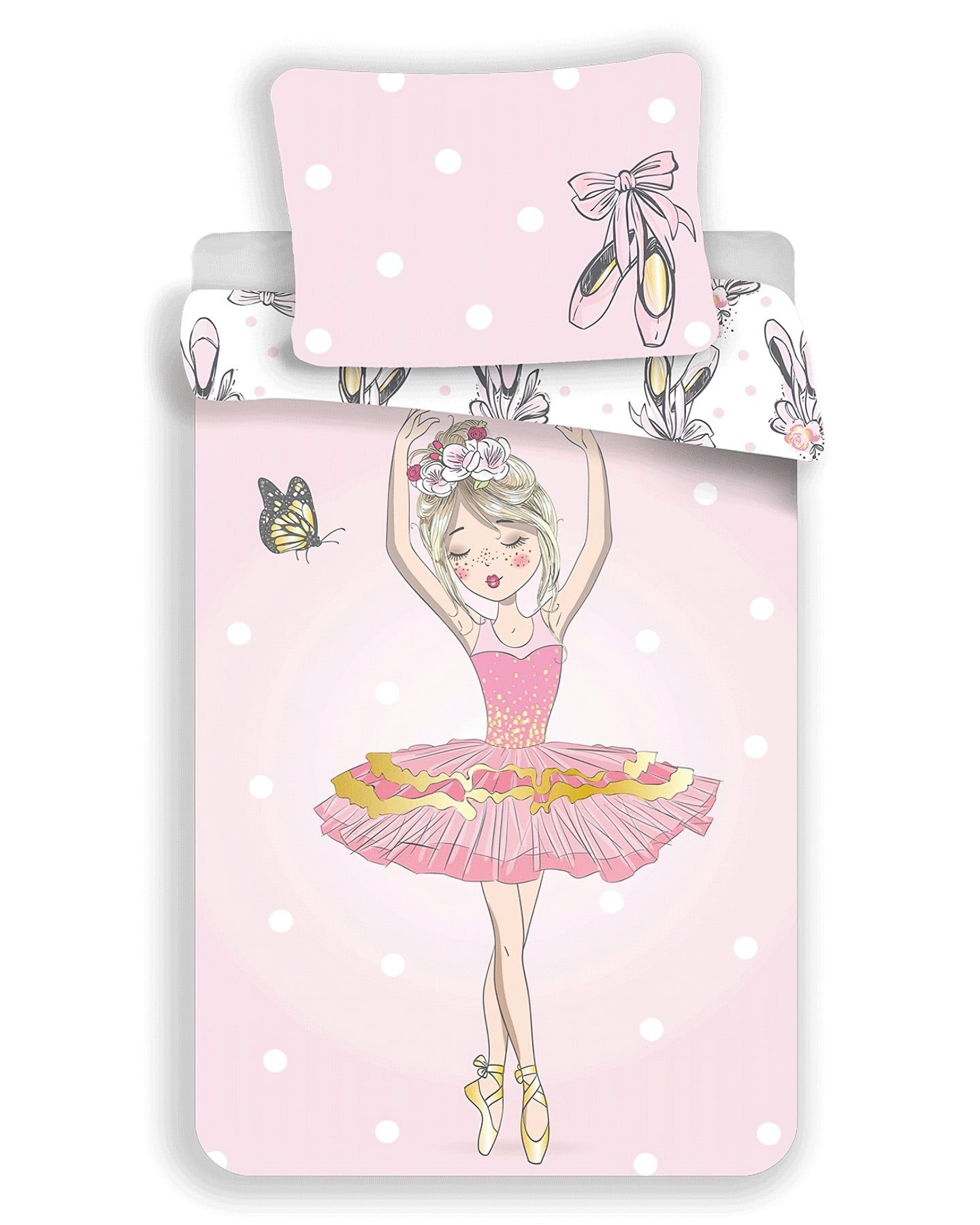 Dětské bavlněné povlečení s motivem baleríny na růžovém podkladu. Rubová strana je bílá s baletními střevíčky. Souprava je vyrobena ze 100% bavlny a obsahuje jeden povlak na přikrývku 140 x 200 cm a jeden povlak na polštář 70 x 90 cm. Zapínání na zip.Dětské povlečení rozveselí každý dětský pokojíček a dětem se v něm bude krásně usínat. Maminky zase ocení vysoce kvalitní materiál, díky kterému si povlečení zachová své vlastnosti i po mnoha vypráních. Díky speciální technice tisku je také zaručena barevná stálost. Povlečení doporučujeme prát na 40°C tiskem dovnitř, při nastavení nižších otáček ždímání si také usnadníte žehlení. Vyberte si to pravé pro Vaše dítě.