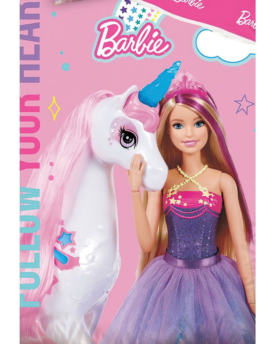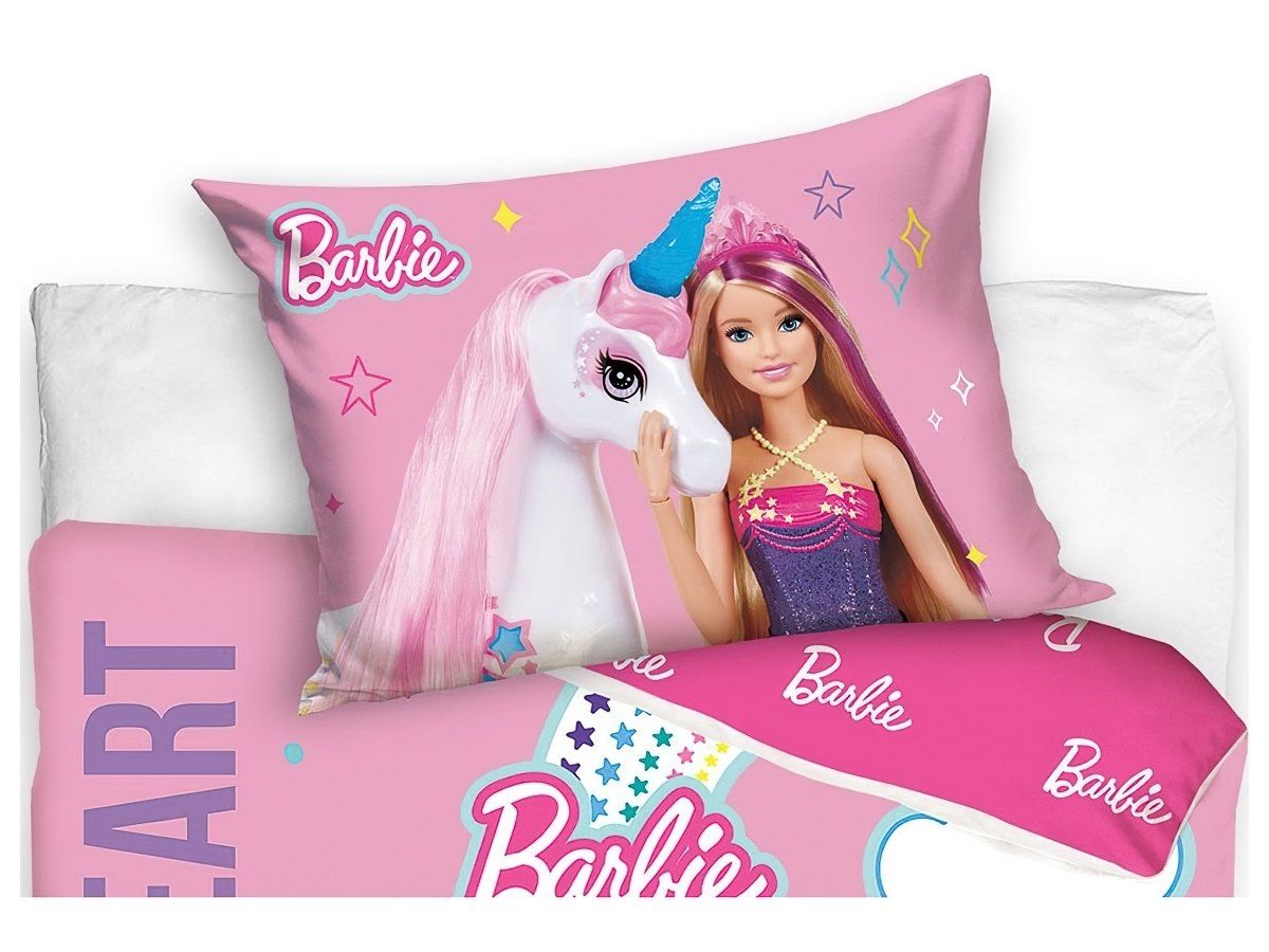 Dětské bavlněné povlečení do postýlky s motivem Barbie a duhového jednorožce na růžovém podkladu. Rubová strana je růžová s bílými nápisy Barbie. Souprava je vyrobena ze 100% bavlny a obsahuje jeden povlak na přikrývku 100 x 135 cm a jeden povlak na polštář 40 x 60 cm. Zapínání na zip.Dětské povlečení rozveselí každý dětský pokojíček a dětem se v něm bude krásně usínat. Maminky zase ocení vysoce kvalitní materiál, díky kterému si povlečení zachová své vlastnosti i po mnoha vypráních. Díky speciální technice tisku je také zaručena barevná stálost. Povlečení doporučujeme prát na 40°C tiskem dovnitř, při nastavení nižších otáček ždímání si také usnadníte žehlení. Vyberte si to pravé pro Vaše dítě.