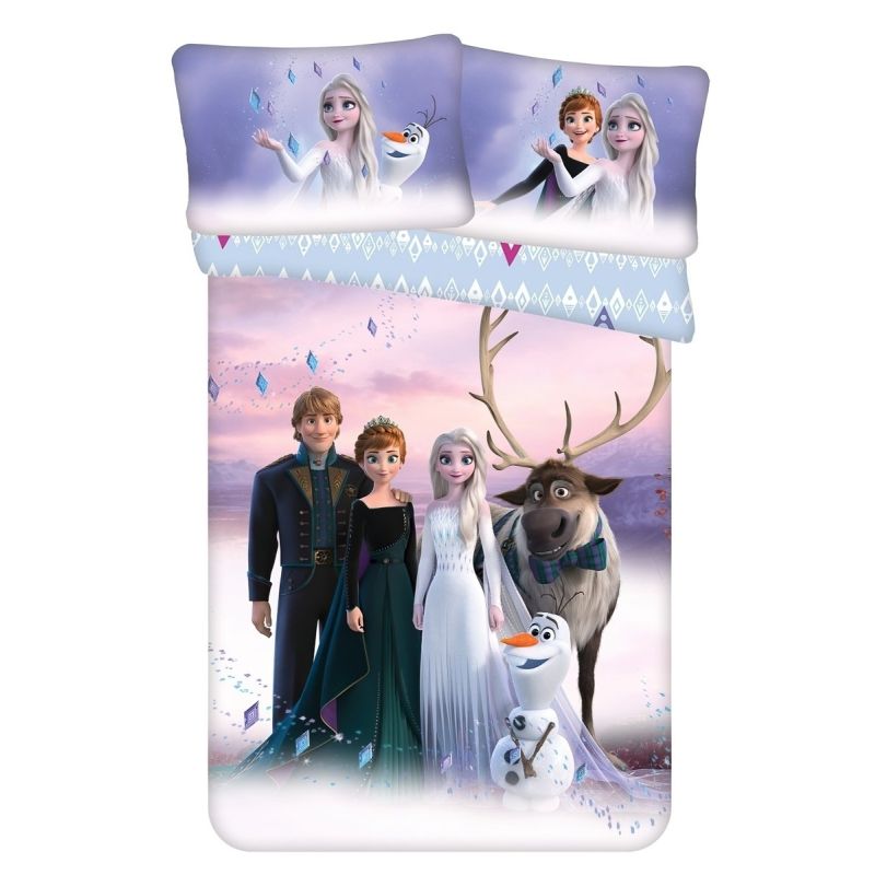 Dětské bavlněné povlečení do postýlky s vzorem Anny, Elzy, Kristoffa. Svena a Olafa z animované pohádky Frozen (ledové království) na fialovo-růžovém podkladu. Povlečení je oboustranné, z druhé strany jsou krystaly na světle modré. Souprava je vyrobena ze 100% bavlny a obsahuje jeden povlak na přikr...