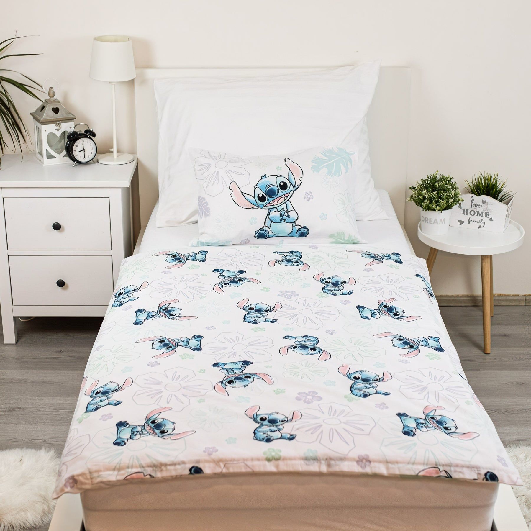 Dětské bavlněné povlečení do postýlky se vzorem malého pejska Stitche z animované komedie Lilo a Stitch na bílém podkladu s exotickými květy. Povlečení je oboustranné z druhé strany jsou malé postavičky s květinami na bílé. Souprava je vyrobena ze 100% bavlny a obsahuje jeden povlak na přikrývku 100 x 135 cm a jeden povlak na polštář 40 x 60 cm. Zapínání na zip.
