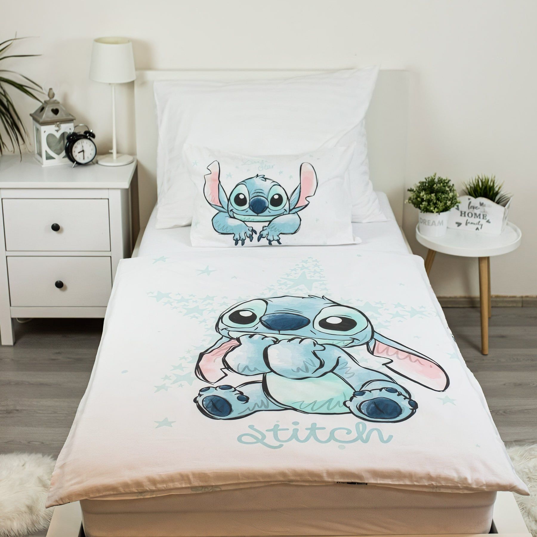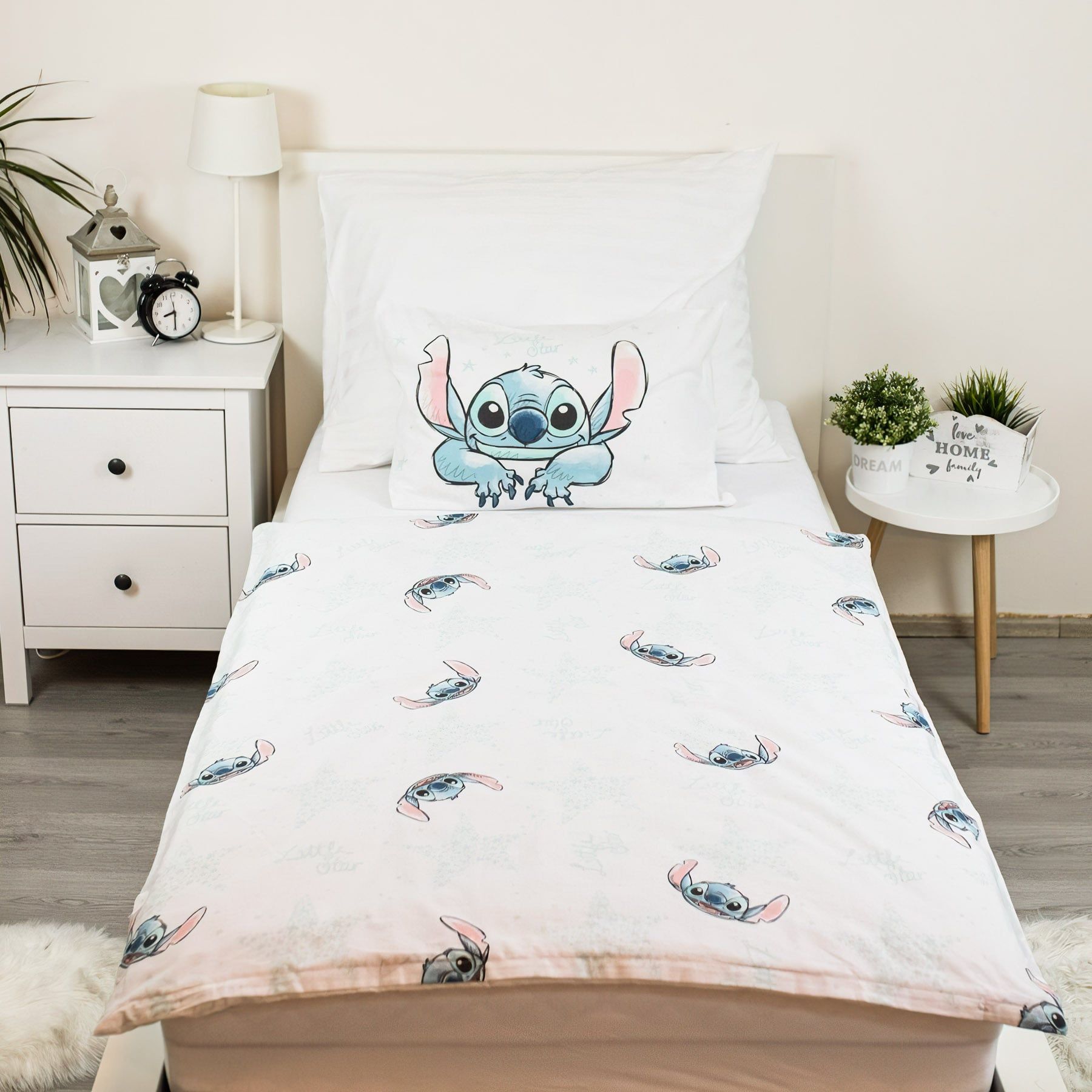 Dětské bavlněné povlečení do postýlky se vzorem malého pejska Stitche z animované komedie Lilo a Stitch na bílém podkladu s s hvězdami. Povlečení je oboustranné z druhé strany jsou malé postavičky s hvězdami na bílé. Souprava je vyrobena ze 100% bavlny a obsahuje jeden povlak na přikrývku 100 x 135 cm a jeden povlak na polštář 40 x 60 cm. Zapínání na zip.Dětské povlečení rozveselí každý pokojíček a Vašim dětem se v něm bude krásně usínat. Maminky zase ocení vysoce kvalitní materiál, díky kterému si povlečení zachová své vlastnosti i po mnoha vypráních. Díky speciální technice tisku je také zaručena barevná stálost. Povlečení doporučujeme prát na 60°C tiskem dovnitř, při nastavení nižších otáček ždímání si také usnadníte žehlení. Vyberte si to pravé pro Vaše dítě.