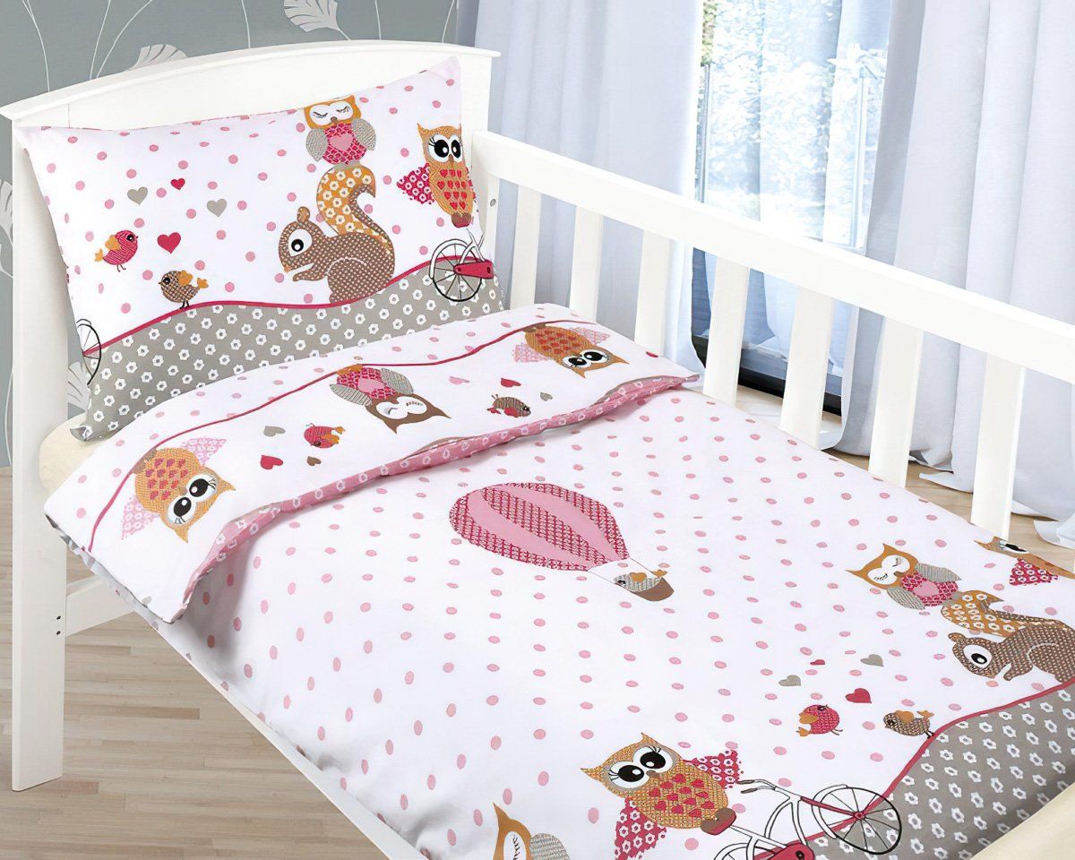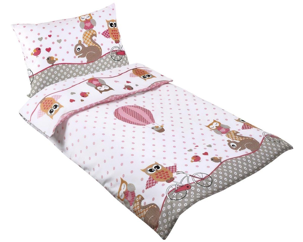 Dětské bavlněné povlečení do postýlky se vzorem růžových soviček a veverek s létajícím balonem na bílém podkladu s růžovými puntíky. Povlečení je z obou stran stejné. Souprava je vyrobena ze 100% bavlny a obsahuje jeden povlak na přikrývku 90 x 135 cm a jeden povlak na polštář 45 x 60 cm. Zapínání na zip.Dětské povlečení rozveselí každý pokojíček a Vašim dětem se v něm bude krásně usínat. Maminky zase ocení vysoce kvalitní materiál, díky kterému si povlečení zachová své vlastnosti i po mnoha vypráních. Díky speciální technice tisku je také zaručena barevná stálost. Povlečení doporučujeme prát na 40°C tiskem dovnitř, krepové povlečení má tu výhodu, že se nežehlí. Vyberte si to pravé pro Vaše dítě.