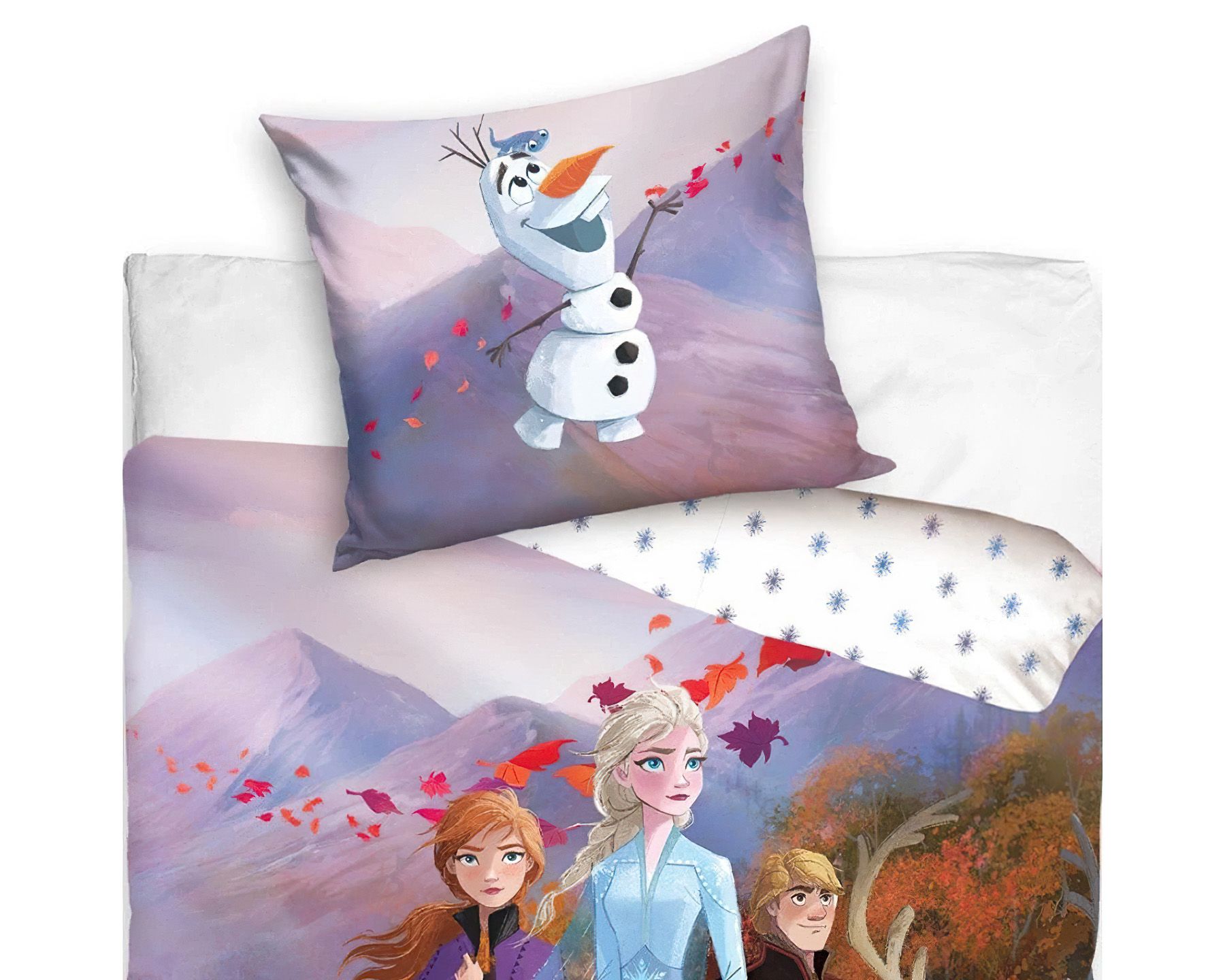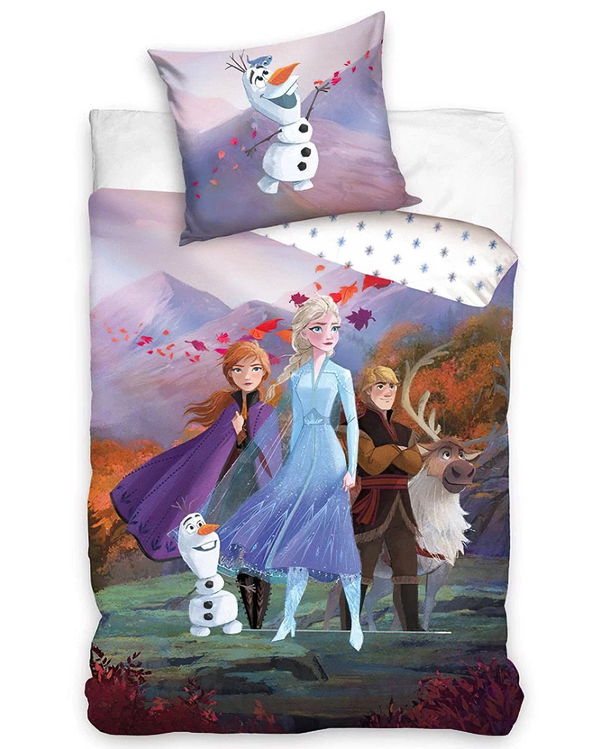 Dětské bavlněné povlečení se vzorem Anny, Elsy, Kristoffa, Olafa a Svena ve fialových odstínech. Povlečení je oboustranné, z druhé strany jsou sněhové vločky na bílé. Souprava je vyrobena ze 100% bavlny a obsahuje jeden povlak na přikrývku 140 x 200 cm a jeden povlak na polštář 70 x 90 cm. Zapínání na zip.Dětské povlečení rozveselí každý pokojíček a Vašim dětem se v něm bude krásně usínat. Maminky zase ocení vysoce kvalitní materiál, díky kterému si povlečení zachová své vlastnosti i po mnoha vypráních. Díky speciální technice tisku je také zaručena barevná stálost. Povlečení doporučujeme prát na 40°C tiskem dovnitř, při nastavení nižších otáček ždímání si také usnadníte žehlení. Vyberte si to pravé pro Vaše dítě.