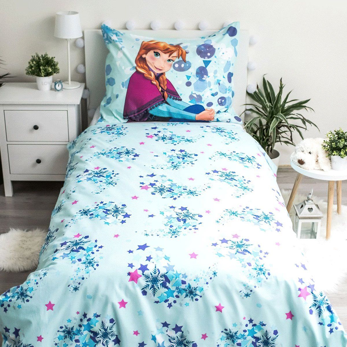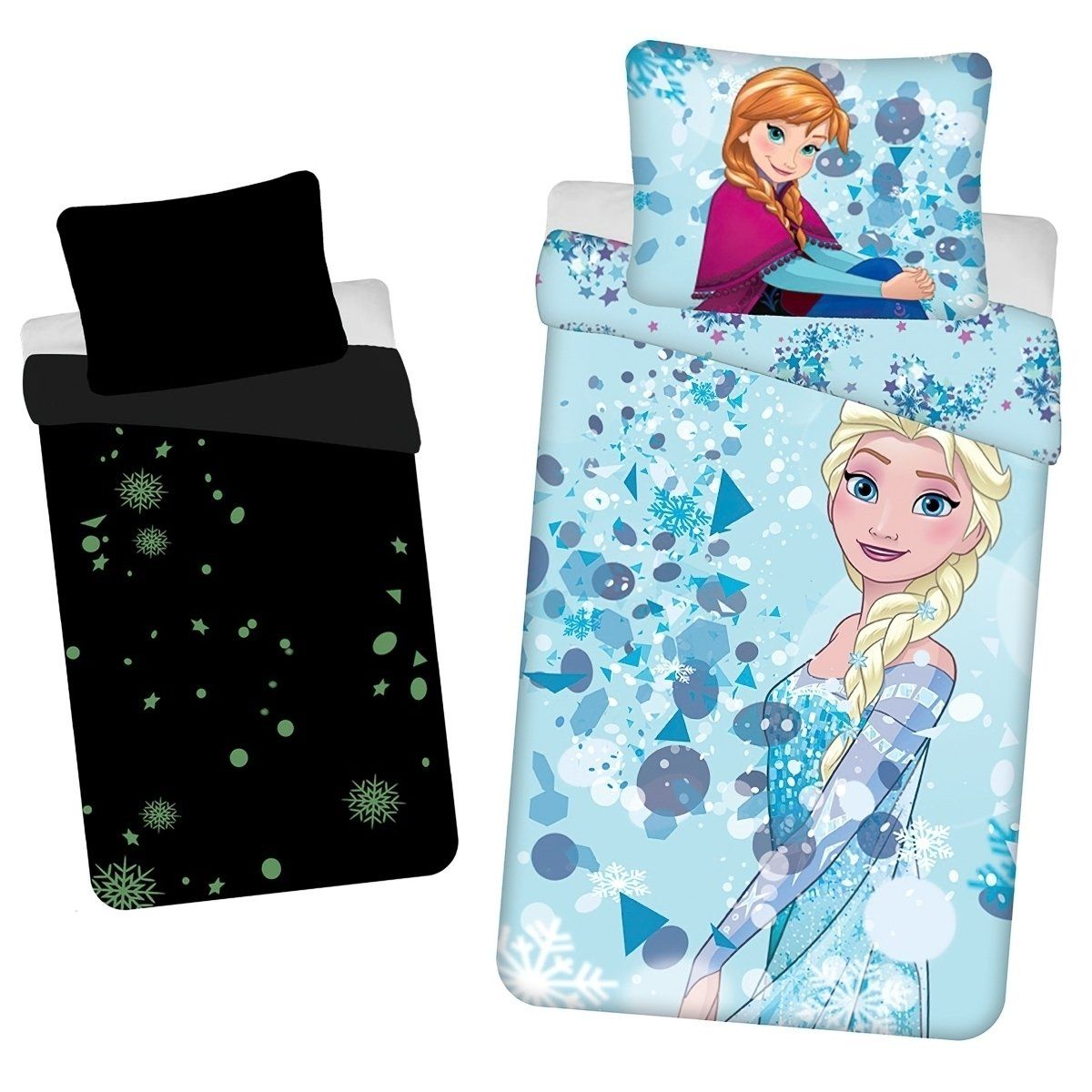 Dětské bavlněné povlečení z kolekce Jerry Fabrics s motivem hlavních hrdinů Anny a Elsy z pohádky Frozen 2 - Ledové království 2 na světle modrém podkladu. Povlečení je oboustranné. Z druhé strany je vzor vloček na světle modrém pozadí. Speciální svítivá vrstva způsobí, že některé části povlečení v noci hezky fosforekují Souprava je vyrobena ze 100% bavlny a obsahuje jeden povlak na přikrývku 140 x 200 cm a jeden povlak na polštář 70 x 90 cm. Zapínání na zip.Dětské povlečení rozveselí každý dětský pokojíček a dětem se v něm bude krásně usínat. Maminky zase ocení vysoce kvalitní materiál, díky kterému si povlečení zachová své vlastnosti i po mnoha vypráních. Díky speciální technice tisku je také zaručena barevná stálost. Povlečení doporučujeme prát na 40°C tiskem dovnitř, při nastavení nižších otáček ždímání si také usnadníte žehlení. Vyberte si to pravé pro Vaše dítě.