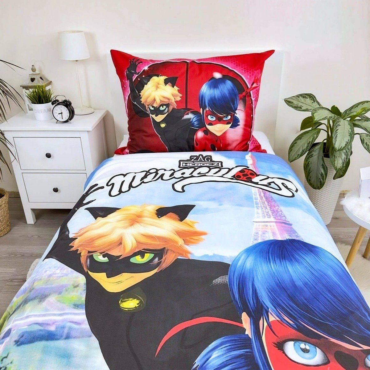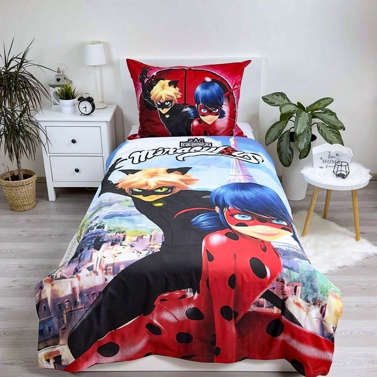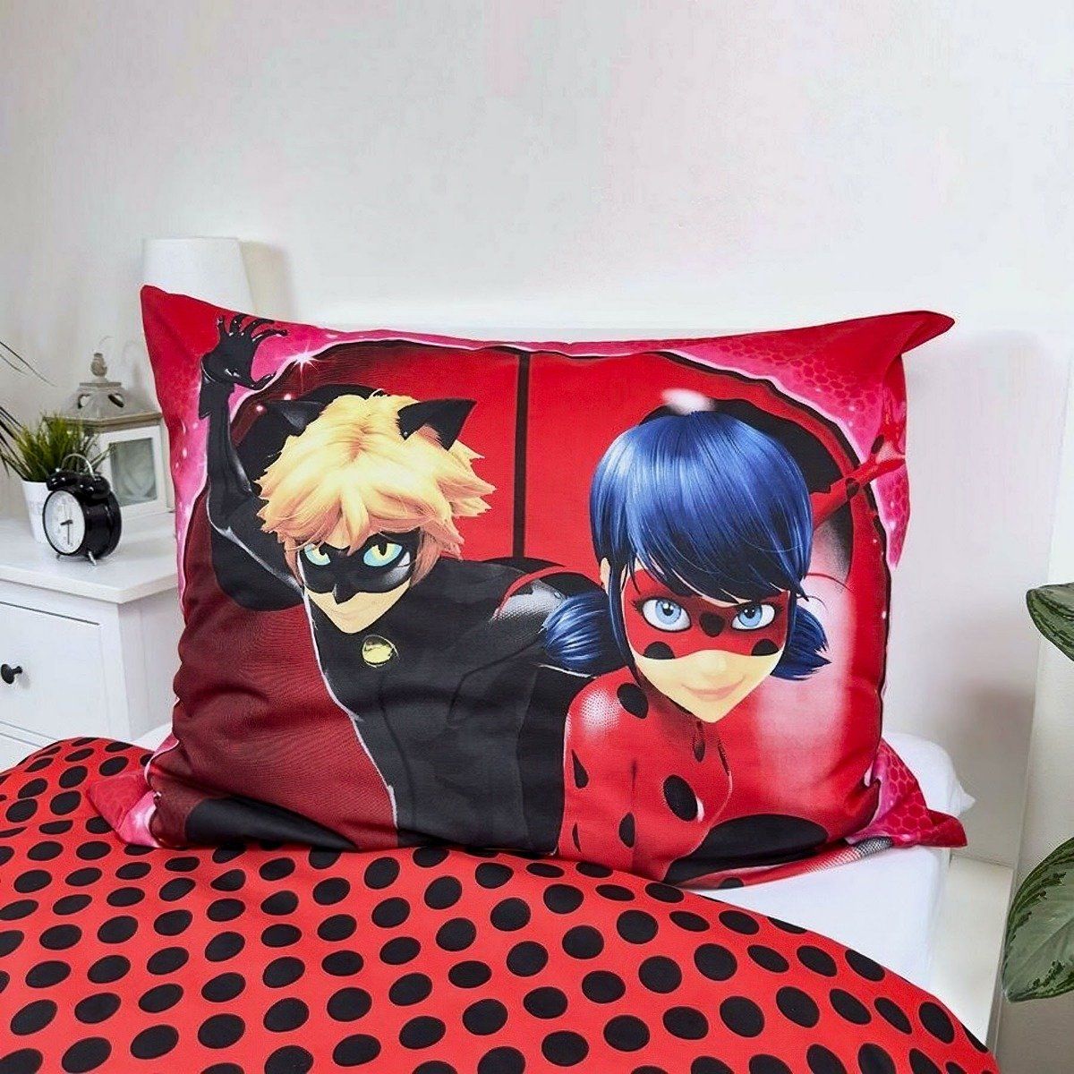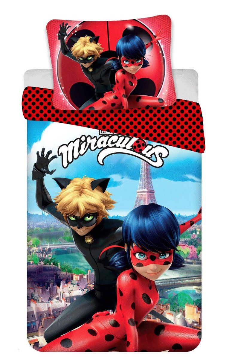 Dětské bavlněné povlečení s motivem kouzelné Berušky (Marinett) s Černým kocourem na modrém pozadí z oblíbeného animovaného seriálu (Miraculous). Z druhé strany jsou puntíky na červené. Souprava je vyrobena ze 100% bavlny a obsahuje jeden povlak na přikrývku 140 x 200 cm a jeden povlak na polštář 70 x 90 cm. Zapínání na zip.Dětské povlečení rozveselí každý dětský pokojíček a dětem se v něm bude krásně usínat. Maminky zase ocení vysoce kvalitní materiál, díky kterému si povlečení zachová své vlastnosti i po mnoha vypráních. Díky speciální technice tisku je také zaručena barevná stálost. Povlečení doporučujeme prát na 40°C tiskem dovnitř, při nastavení nižších otáček ždímání si také usnadníte žehlení. Vyberte si to pravé pro Vaše dítě.