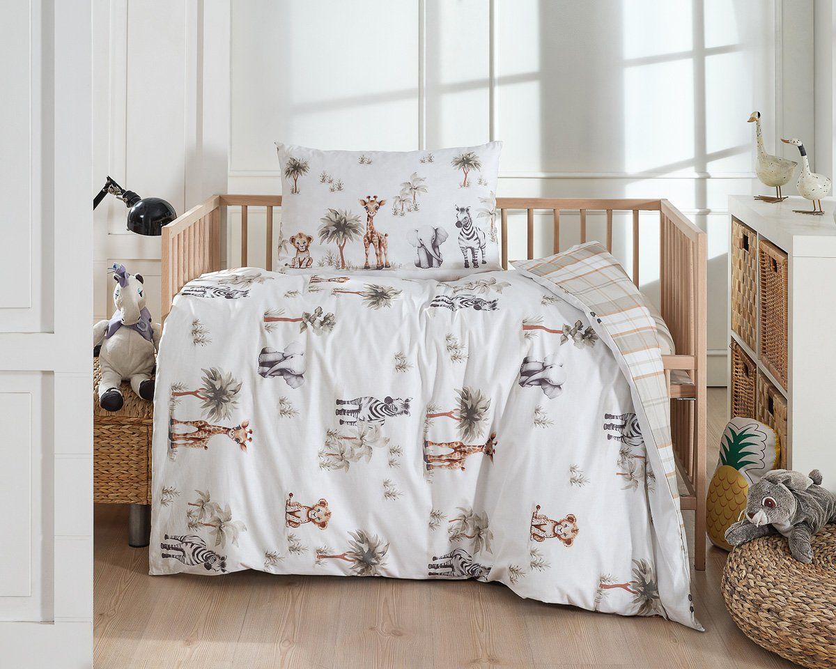 Dětské bavlněné povlečení do postýlky se vzorem safari zvířátek na bílém podkladu. Povlečení je oboustranné, z druhé strany je vzor zeleného kára. Souprava je vyrobena ze 100% bavlny a obsahuje jeden povlak na přikrývku a jeden povlak na polštář. Zapínání na zip.