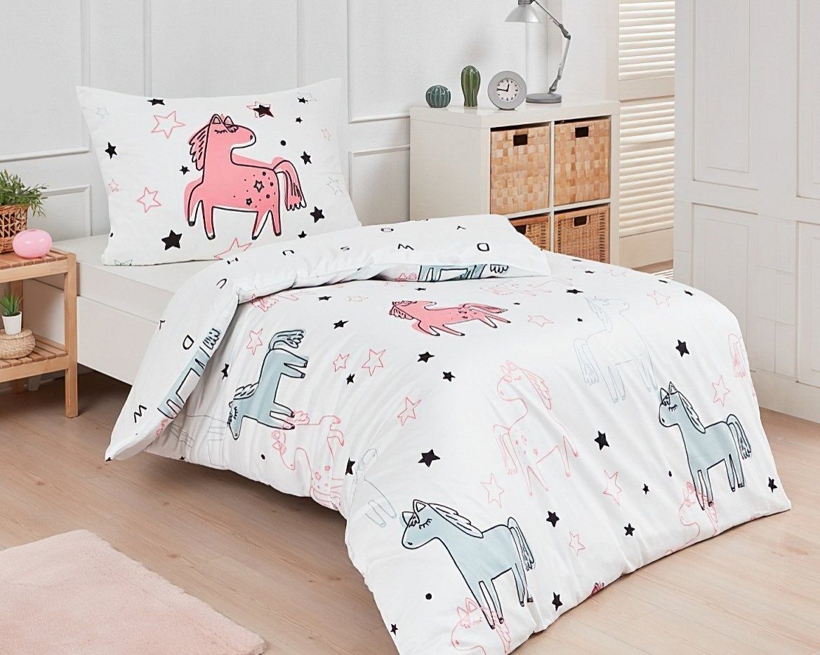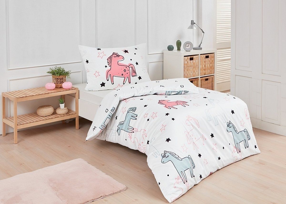 Dětské bavlněné povlečení s motivem růžových, bílých a modrých poníků na bílém podkladu. Vrchní strana odpovídá fotografii, spodní strana je bílá s písmenky. Souprava je vyrobena ze 100% bavlny a obsahuje jeden povlak na přikrývku 140 x 200 cm a jeden povlak na polštář 70 x 90 cm. Zapínání na zip.Povlečení z kolekce Matějovský ze 100% bavlny. U povlečení z kolekce Matějovský je použit vysoce kvalitní materiál se speciální úpravou, díky které je pevnější a zachová si svůj tvar i po mnoha vypráních. Díky speciální technice tisku je také zaručena barevná stálost. Povlečení doporučujeme prát na 40°C tiskem dovnitř, při nastavení nižších otáček ždímání si také usnadníte žehlení s výjimkou krepového povlečení, které se nežehlí. Vyberte si to pravé právě pro Vás!
