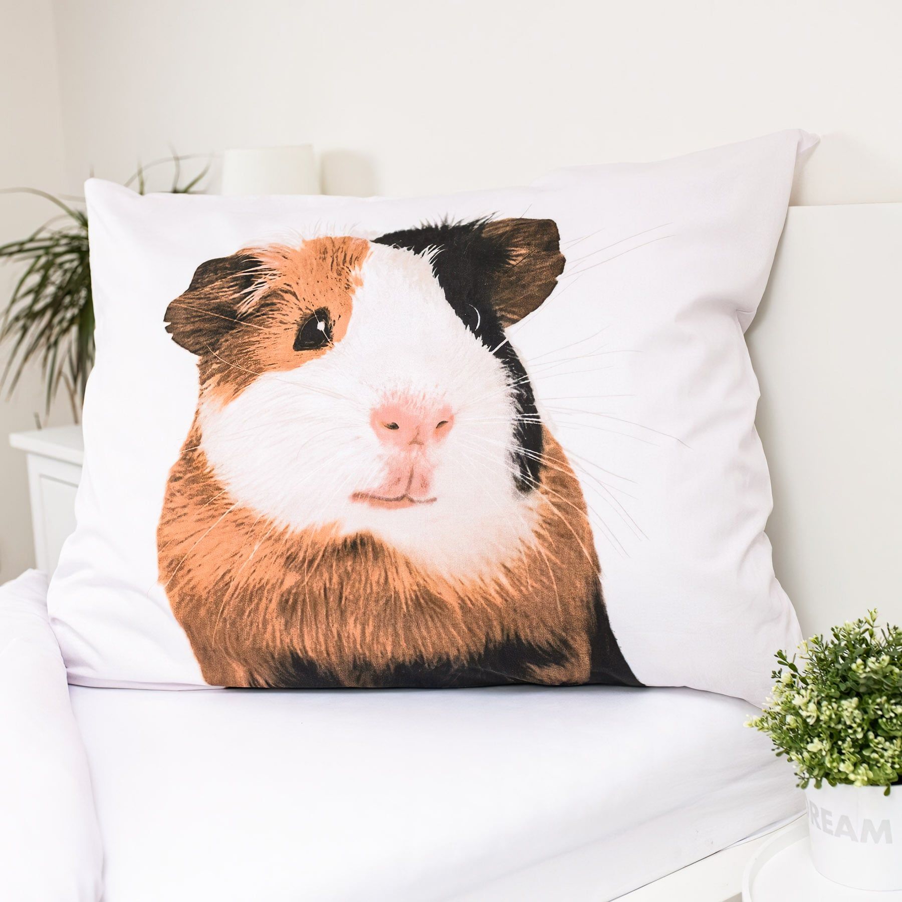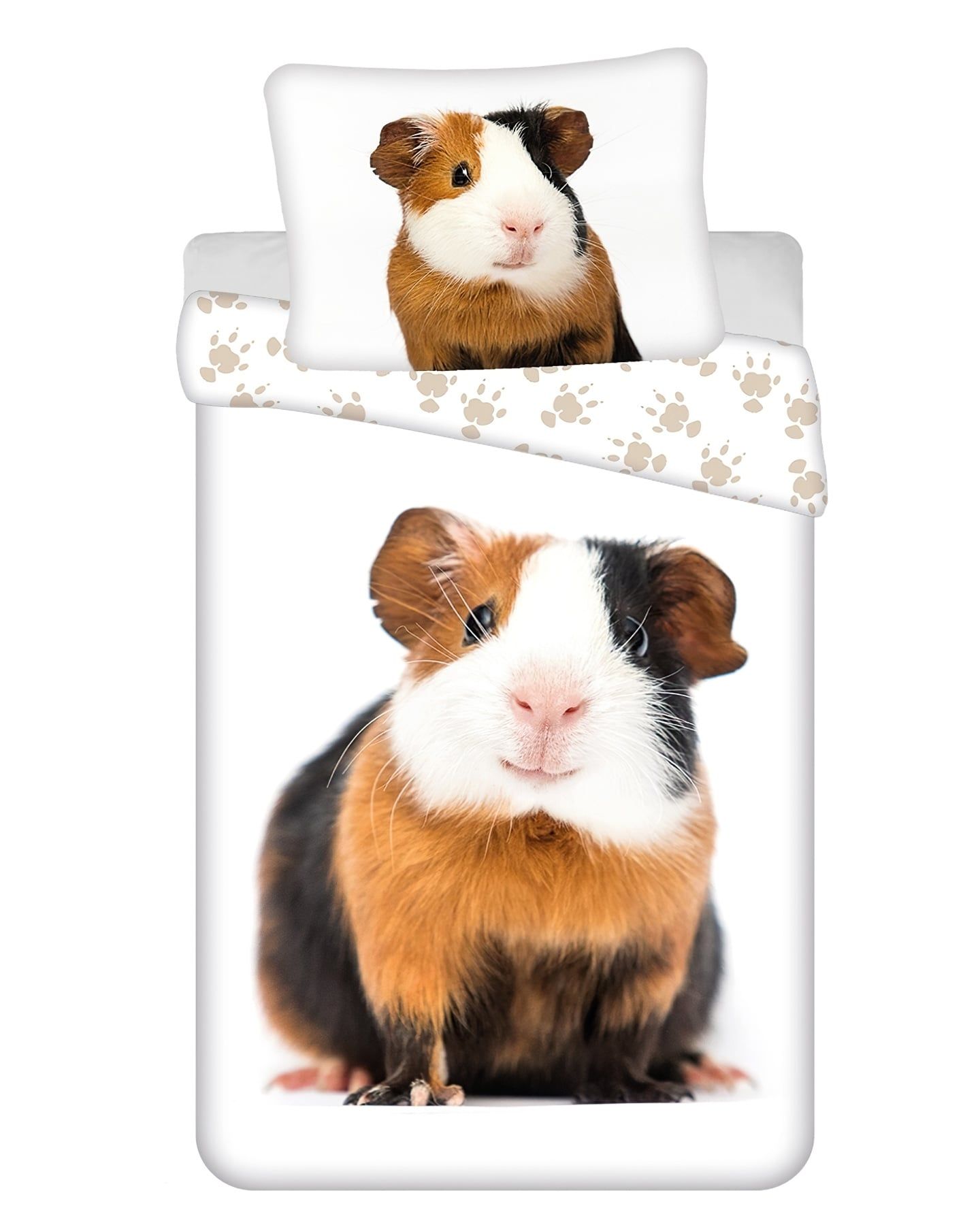 Dětské bavlněné povlečení se vzorem morčete na bílém pozadí. Povlečení je oboustranné, z druhé strany jsou tlapky na bíl...