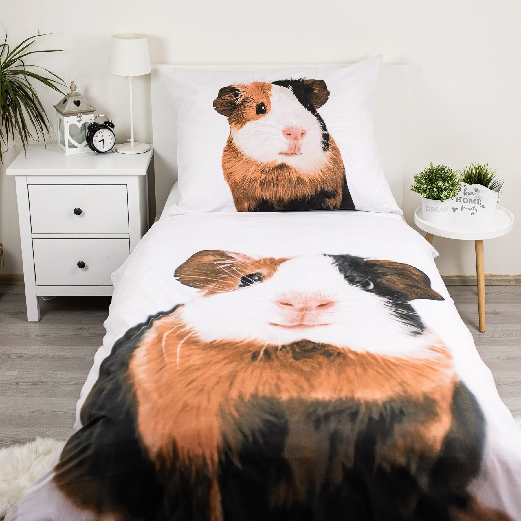 Dětské bavlněné povlečení se vzorem morčete na bílém pozadí. Povlečení je oboustranné, z druhé strany jsou tlapky na bílém podkladu. Souprava je vyrobena ze 100% bavlny a obsahuje jeden povlak na přikrývku 140 x 200 cm a jeden povlak na polštář 70 x 90 cm. Zapínání na zip.