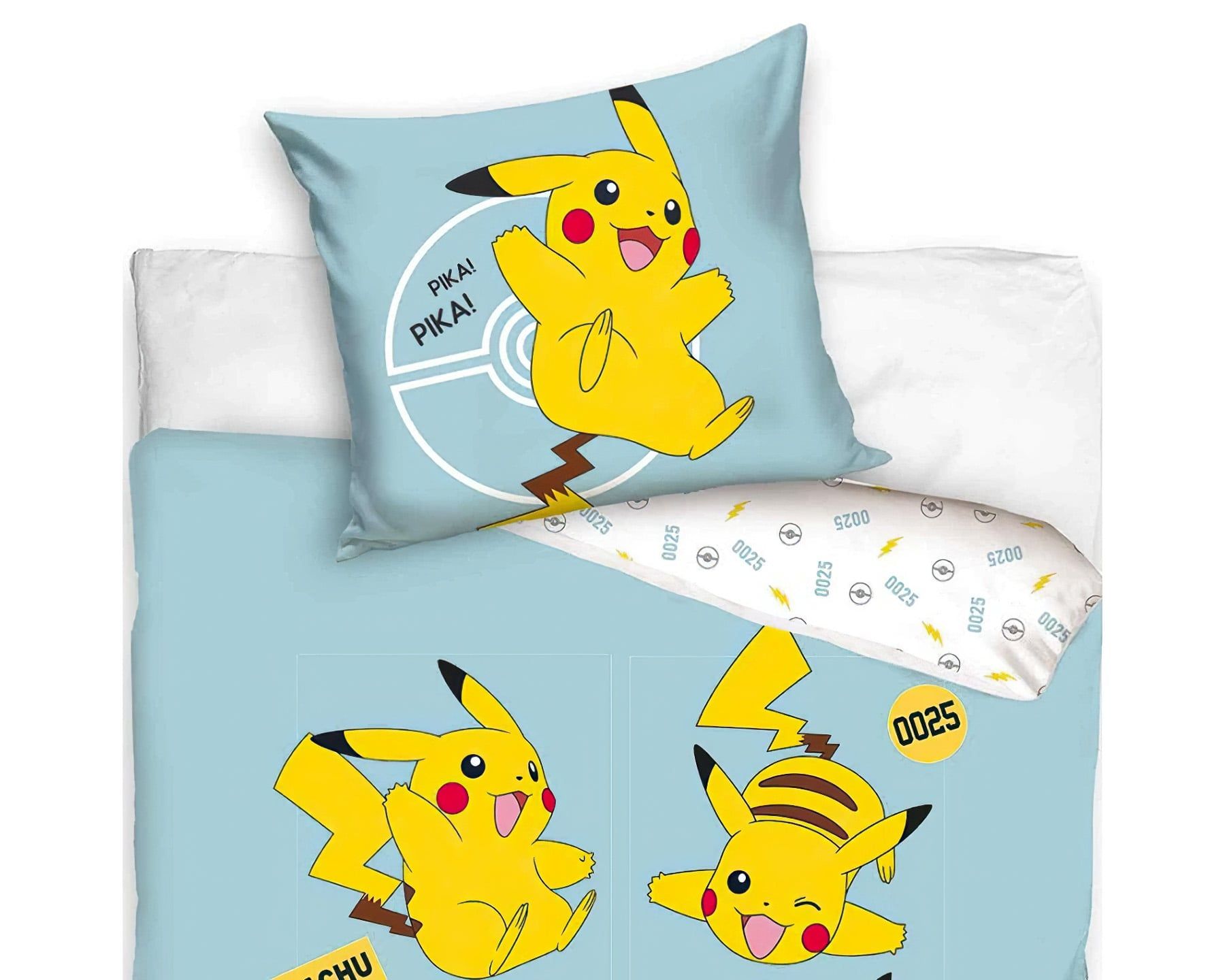 Dětské bavlněné povlečení s motivem Pikachu z legendárního světa Pokémonů ve čtyřech polohách na světle mintovém podkladu. Rubová strana má vzor malých čísel a loga na bílé. Souprava je vyrobena ze 100% bavlny a obsahuje jeden povlak na přikrývku 140 x 200 cm a jeden povlak na polštář 70 x 90 cm. Zapínání na zip.Dětské povlečení rozveselí každý dětský pokojíček a dětem se v něm bude krásně usínat. Maminky zase ocení vysoce kvalitní materiál, díky kterému si povlečení zachová své vlastnosti i po mnoha vypráních. Díky speciální technice tisku je také zaručena barevná stálost. Povlečení doporučujeme prát na 40°C tiskem dovnitř, při nastavení nižších otáček ždímání si také usnadníte žehlení. Vyberte si to pravé pro Vaše dítě.
