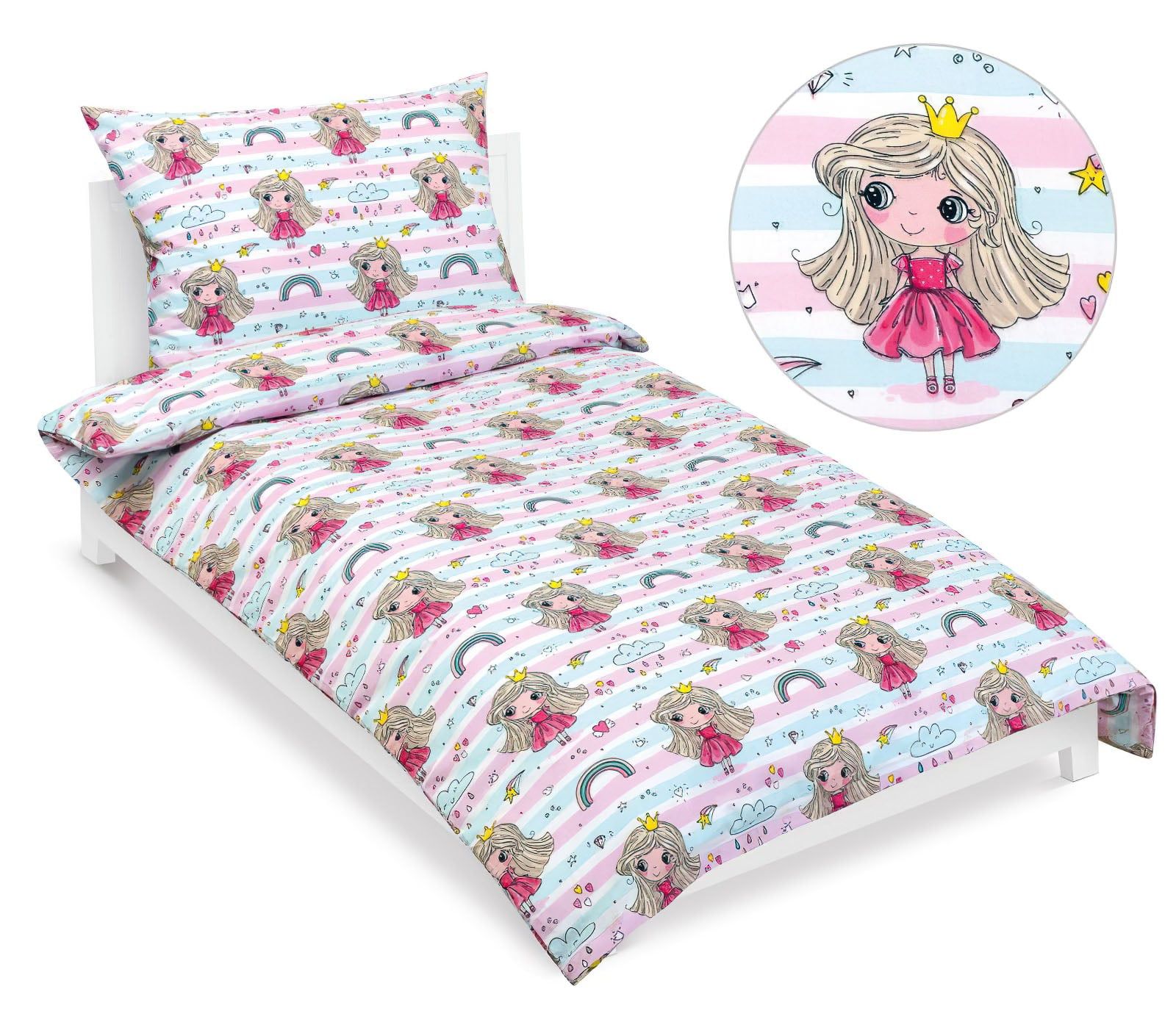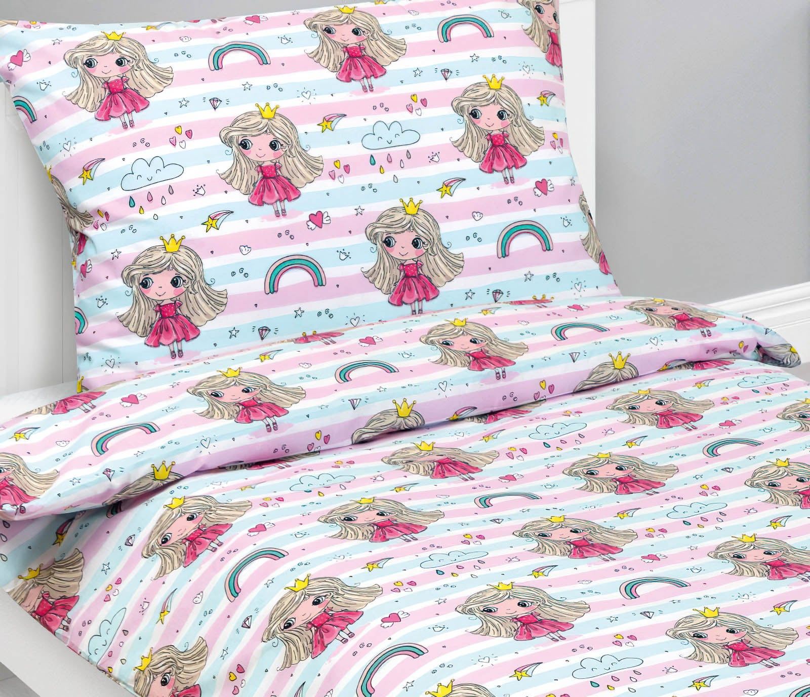 Dětské bavlněné povlečení s motivem princezen s duhou na podkladu s růžovými a modrými proužky. Povlečení je z obou stran stejné. Souprava je vyrobena ze 100% bavlny a obsahuje jeden povlak na přikrývku 140 x 200 cm a jeden povlak na polštář 70 x 90 cm. Zapínání na zip.Dětské povlečení rozveselí každý dětský pokojíček a dětem se v něm bude krásně usínat. Toto povlečení je jako stvořené pro všechny malé závodníky. Maminky zase ocení vysoce kvalitní materiál, díky kterému si povlečení zachová své vlastnosti i po mnoha vypráních. Díky speciální technice tisku je také zaručena barevná stálost. Povlečení doporučujeme prát na 40°C tiskem dovnitř, při nastavení nižších otáček ždímání si také usnadníte žehlení. Vyberte si to pravé pro Vaše dítě.