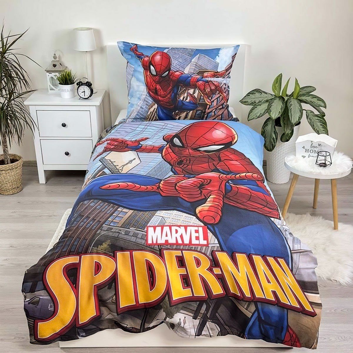 Dětské bavlněné povlečení s motivem komiksového hrdiny Spidermana před světle modrým pozadím městské oblohy a městských mrakodrapů. Z druhé strany je povlečení modré s obrázky pavučin a siluety spidermana. Povlak na polštář má vzor Spidermana. Souprava je vyrobena ze 100% bavlny a obsahuje jeden povlak na přikrývku 140 x 200 cm a jeden povlak na polštář 70 x 90 cm. Zapínání na zip.Dětské povlečení rozveselí každý dětský pokojíček a dětem se v něm bude krásně usínat. Povlečení s pavoučím hrdinou Spidermanem na světle modrém podkladu, které jistě každý malý kluk zná z kreslených komiksů, seriálů a filmů. Maminky zase ocení vysoce kvalitní materiál, díky kterému si povlečení zachová své vlastnosti i po mnoha vypráních. Díky speciální technice tisku je také zaručena barevná stálost. Povlečení doporučujeme prát na 40°C tiskem dovnitř, při nastavení nižších otáček ždímání si také usnadníte žehlení. Vyberte si to pravé pro Vaše dítě.