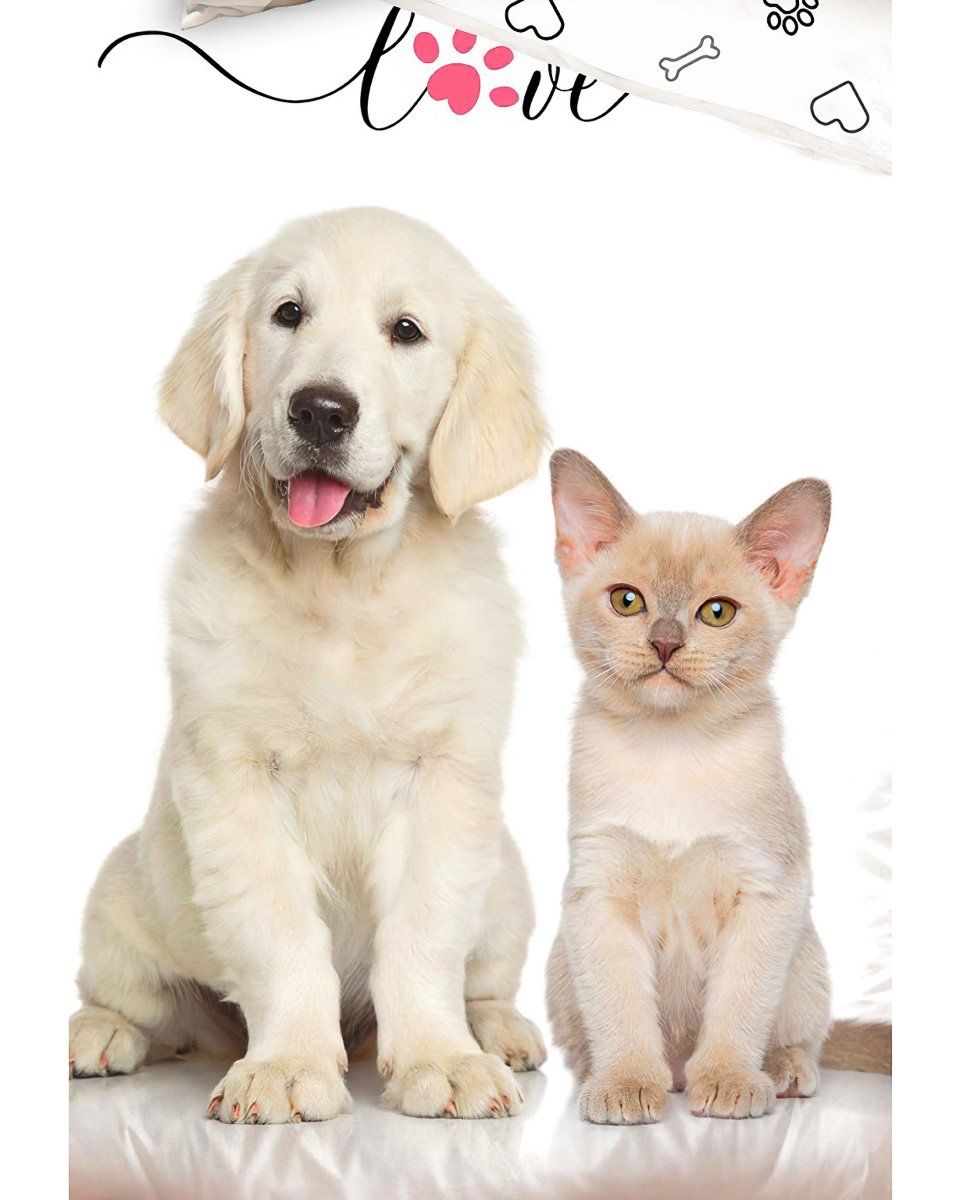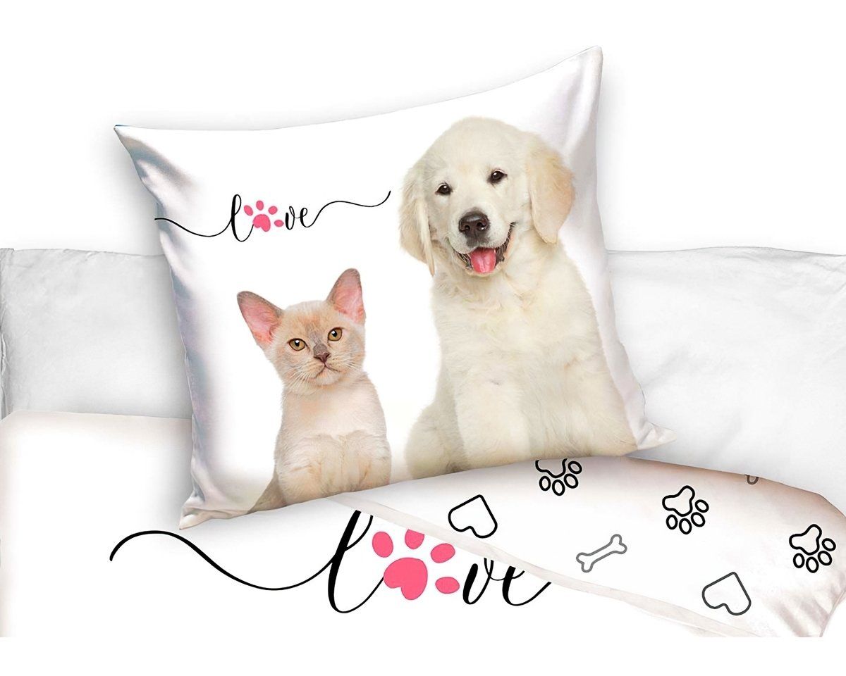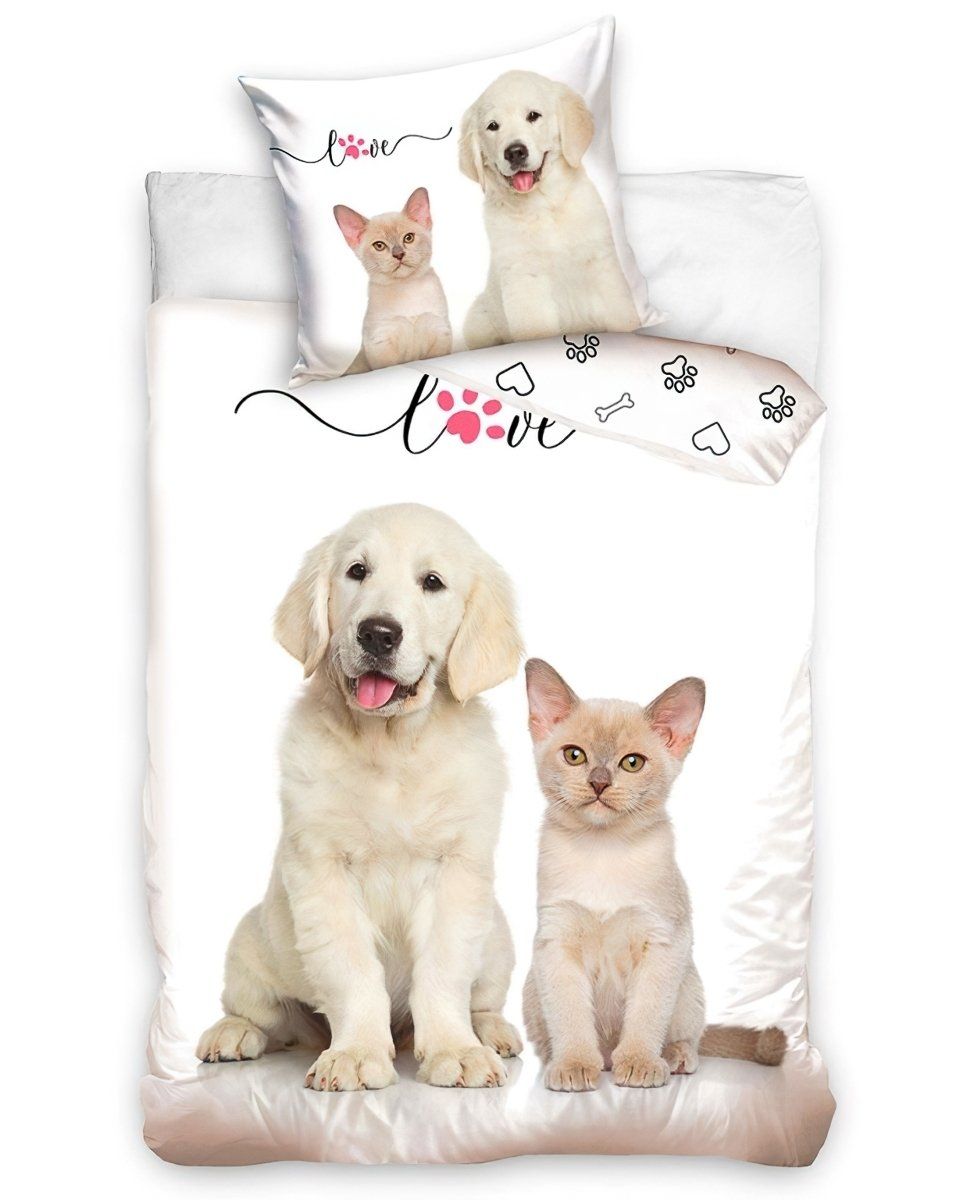 Bavlněné povlečení s motivem štěňátka a koťátka na bílém podkladu. Povlečení je oboustranné, z druhé strany má vzor černých tlapek na bílé. Souprava je vyrobena ze 100% bavlny renforcé a obsahuje jeden povlak na přikrývku 140 x 200 cm a jeden povlak na polštář 70 x 90 cm. Zapínání na zip.Povlečení s krásným vzorem oživí nejen vaši ložnici, ale také každý dětský pokojíček. Oceníte vysoce kvalitní materiál, díky kterému si povlečení zachová své vlastnosti i po mnoha vypráních. Díky speciální technice tisku je také zaručena barevná stálost. Povlečení doporučujeme prát na 60°C tiskem dovnitř, při nastavení nižších otáček ždímání si také usnadníte žehlení.