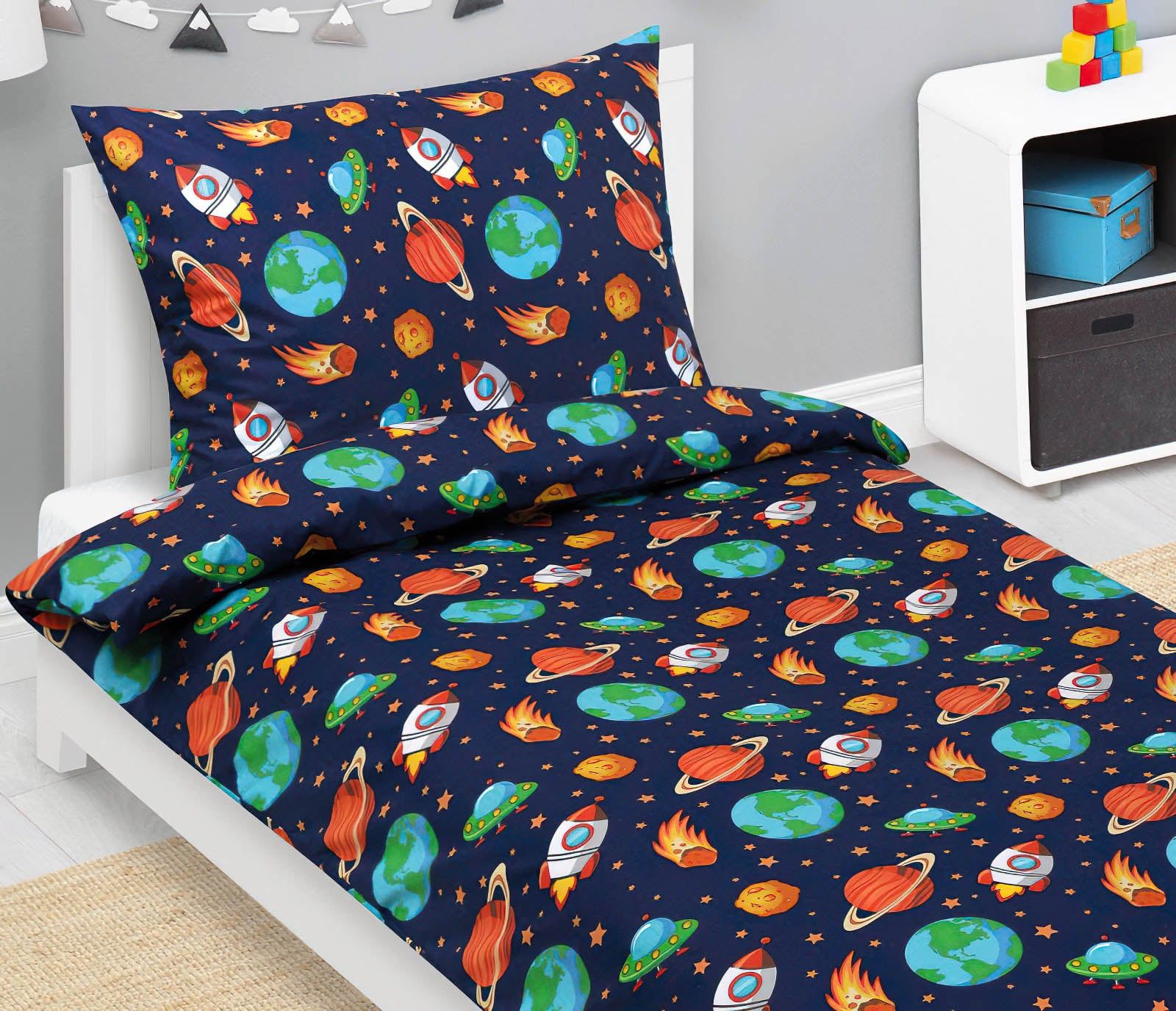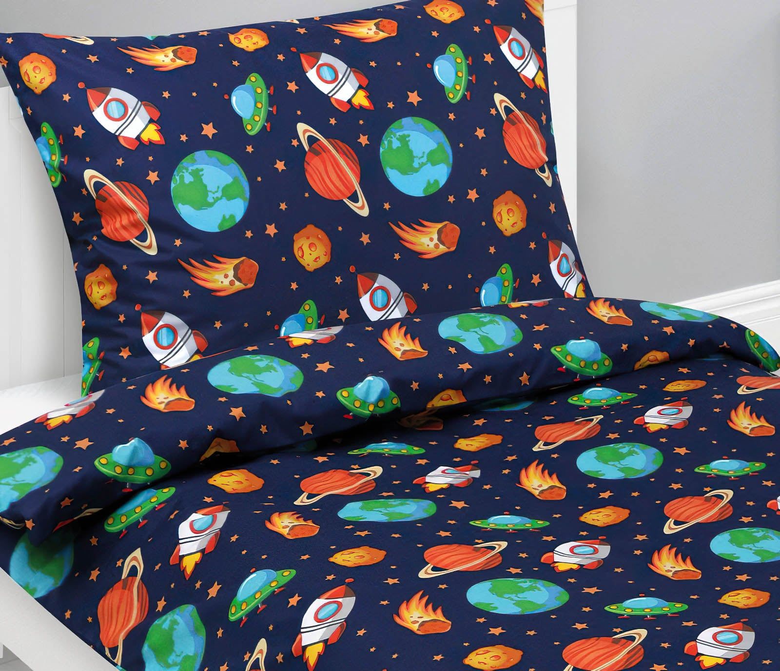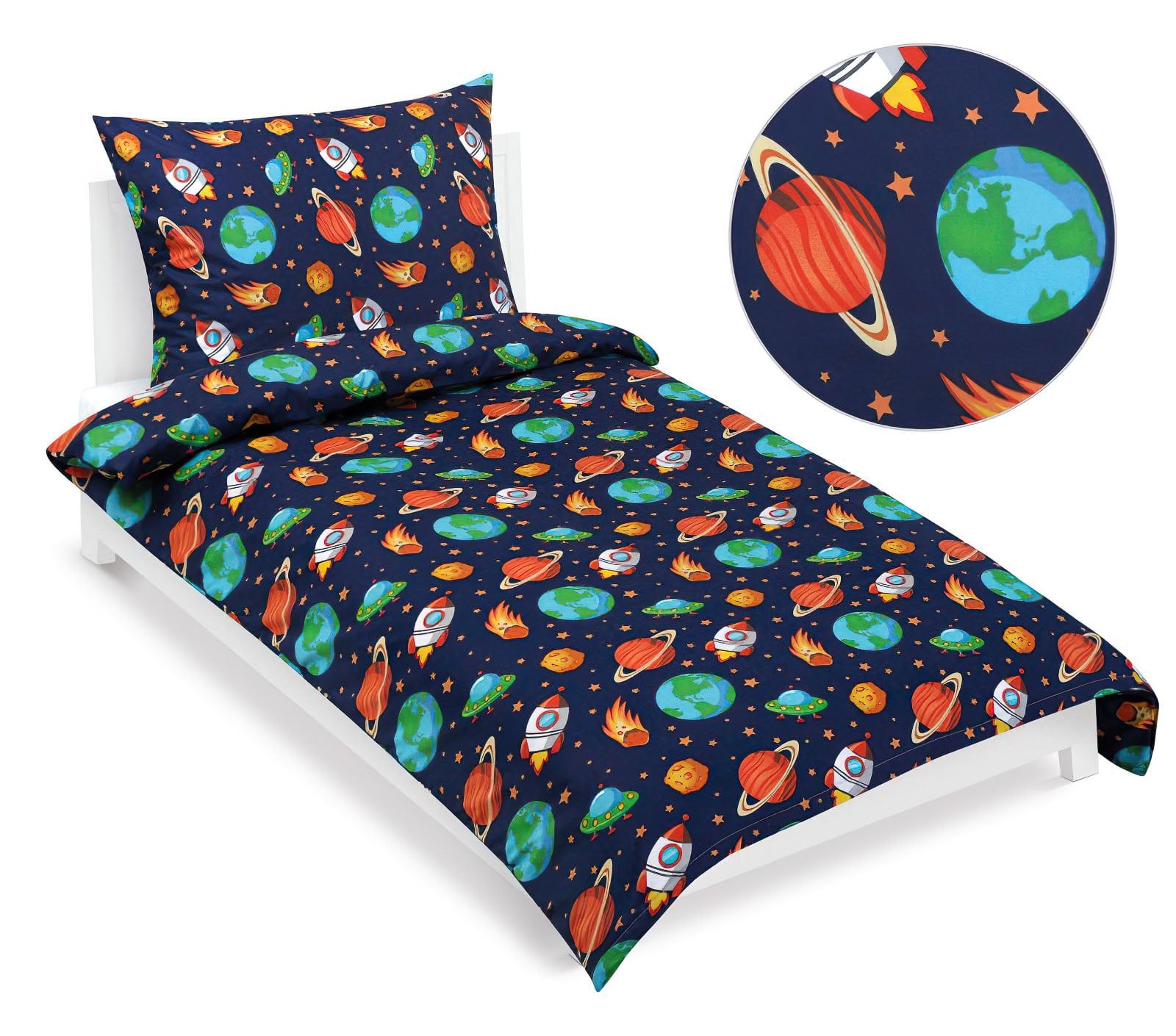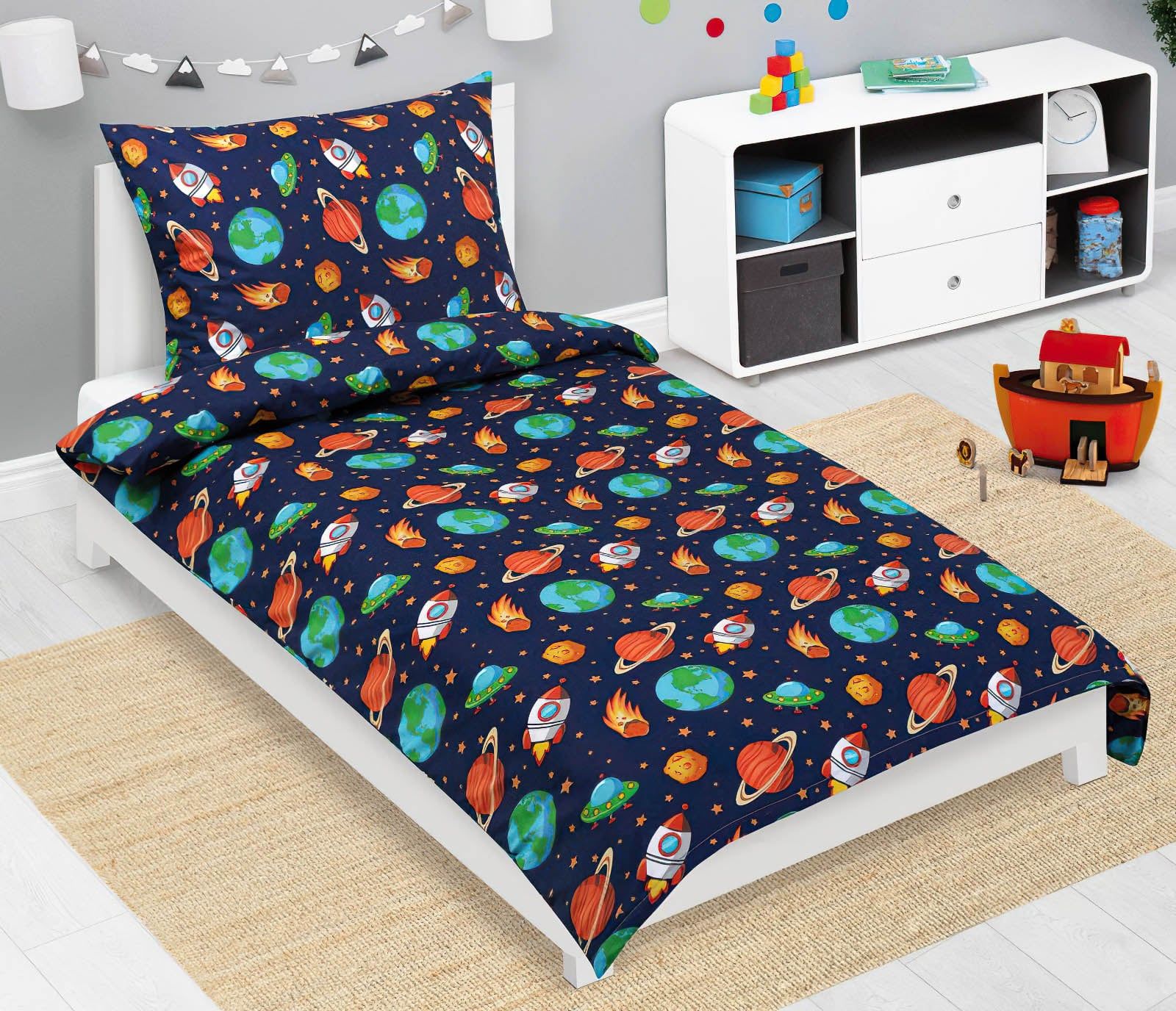 Dětské bavlněné povlečení s motivem planet ve vesmíru na tmavě modrém podkladu. Povlečení je z obou stran stejné. Souprava je vyrobena ze 100% bavlny a obsahuje jeden povlak na přikrývku 140 x 200 cm a jeden povlak na polštář 70 x 90 cm. Zapínání na zip.Dětské povlečení rozveselí každý dětský pokojíček a dětem se v něm bude krásně usínat. Toto povlečení je jako stvořené pro všechny malé závodníky. Maminky zase ocení vysoce kvalitní materiál, díky kterému si povlečení zachová své vlastnosti i po mnoha vypráních. Díky speciální technice tisku je také zaručena barevná stálost. Povlečení doporučujeme prát na 40°C tiskem dovnitř, při nastavení nižších otáček ždímání si také usnadníte žehlení. Vyberte si to pravé pro Vaše dítě.