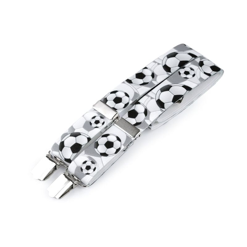 Dětské šle v bílé barvě s fotbalovým vzorem míčů s nastavitelnou délkou 70 cm, šíře 2,5cm v provedení ve tvaru písmene "Y" s uchycením na žabky.