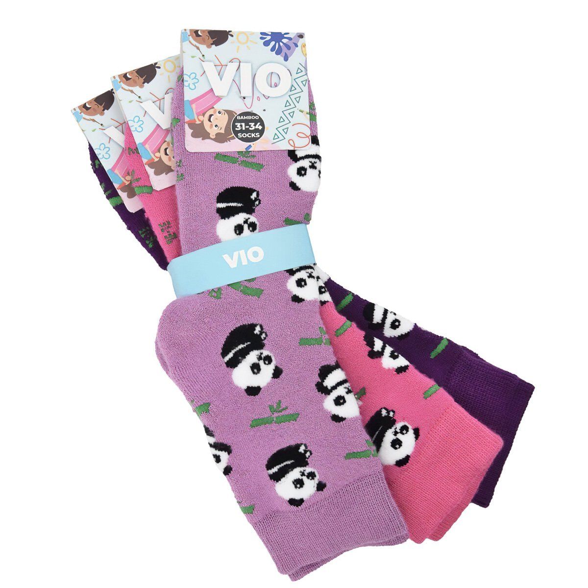 Dětské barevné, teplé froté bambusové a antibakteriální ponožky od značky VIO v růžové barvě s pandami. Ponožky jsou příjemné, teplé a dobře se navlékají. Cena je uvedena za balení obsahující 3 páry ponožek.