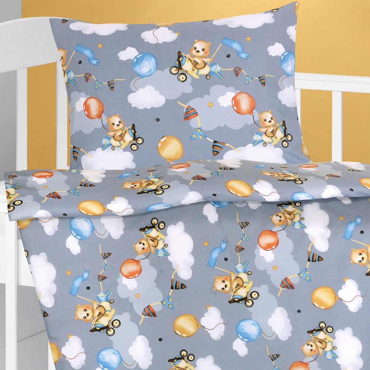 Dětské povlečení do postýlky MEDVÍDEK V LETADLE, šedé, bavlna hladká, 90x135cm + 45x60cm