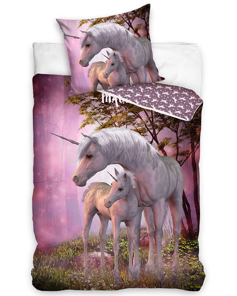 Bavlněné povlečení s motivem dvou bájných jednorožců na růžovém podkladu. Povlečení je oboustranné, z druhé strany má vzor bílých jednorožců na růžové. Souprava je vyrobena ze 100% bavlny renforcé a obsahuje jeden povlak na přikrývku 140 x 200 cm a jeden povlak na polštář 70 x 90 cm. Zapínání na zip.Povlečení s krásným vzorem oživí nejen vaši ložnici, ale také každý dětský pokojíček. Oceníte vysoce kvalitní materiál, díky kterému si povlečení zachová své vlastnosti i po mnoha vypráních. Díky speciální technice tisku je také zaručena barevná stálost. Povlečení doporučujeme prát na 60°C tiskem dovnitř, při nastavení nižších otáček ždímání si také usnadníte žehlení.