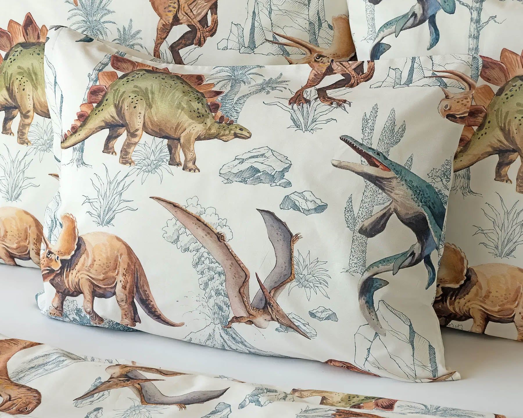 Bavlněné povlečení se vzorem ze světa dinosaurů na bílém pozadí. Povlak na přikrývku i povlak na polštář jsou z obou stran stejné. Souprava je vyrobena ze 100% bavlny a obsahuje jeden povlak na přikrývku 140 x 200 cm a jeden povlak na polštář 70 x 90 cm. Zapínání na zip.