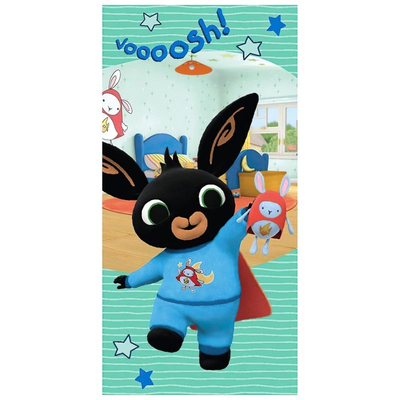 Dětská plážová osuška s motivem oblíbené postavičky Zajíčka Binga a jeho superhrdiny Hopittiho v tyrkysové barvě ze stejnojmenného seriálu a dětských knih. Osuška je z lícové strany s potiskem, z rubu má jemné froté smyčky bez potisku. Osuška je vyrobena ze 100% bavlny s gramáží 300g/m2....