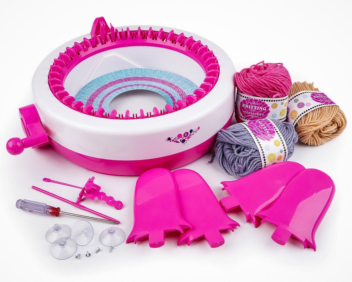 Mlýnek na pletení čepic, šál, ponožek a dalších doplňků. Balení obsahuje 1 pletací mlýnek, 1 plastovou jehlu na přízi, 1 plastový háček, 3 klubíčka příze, kovový šroubovák, 4 kovové šroubky na přišroubování nožek a 4 přísavky, pomocí kterých mlýnek připevníte ke stolu. Průměr pletací části je 24 cm, dokola je 40 pletacích háčků (jehel). Doporučená síla příze je na jehlice 4 - 5. Velikost mlýnku je 19 x 35 cm.