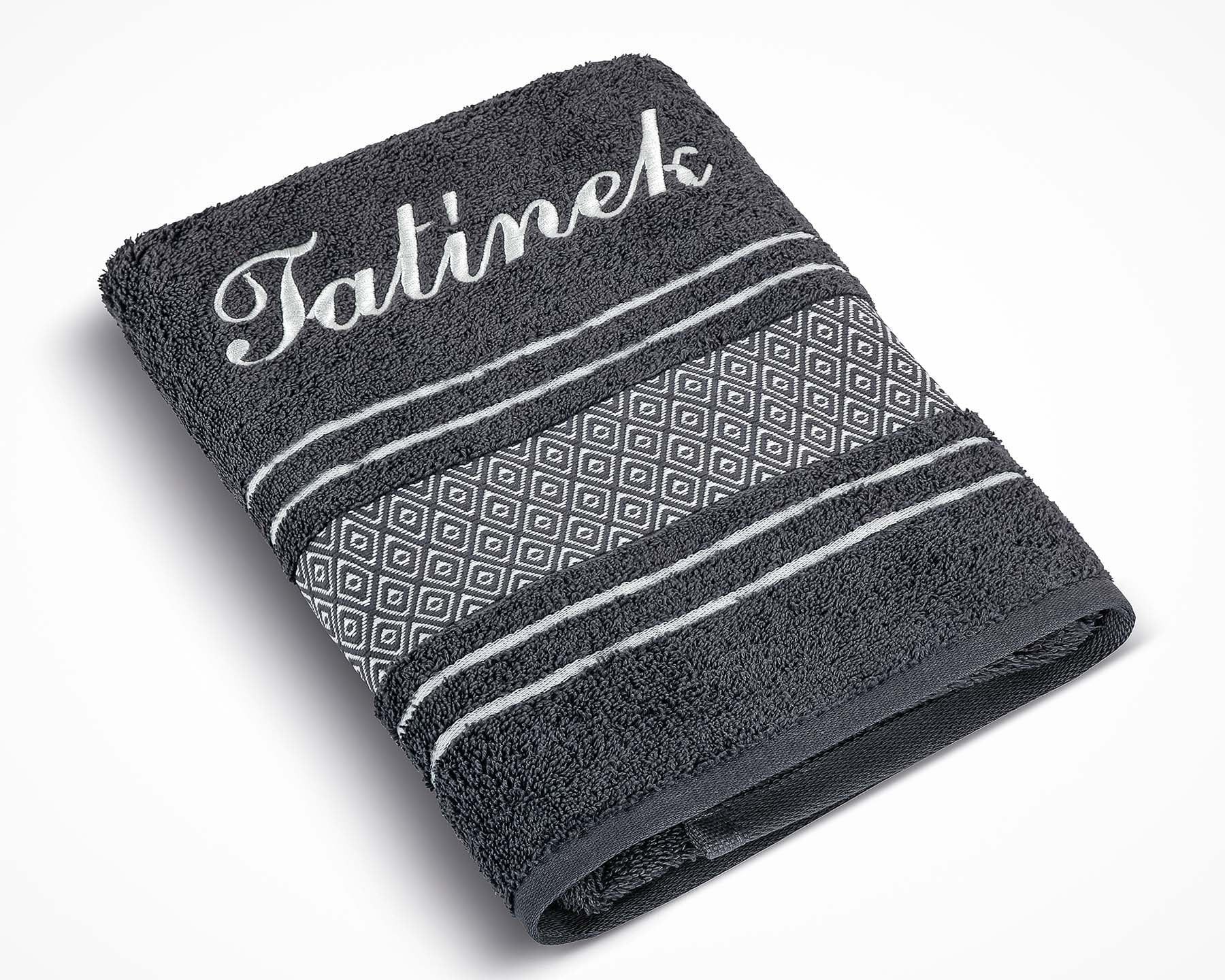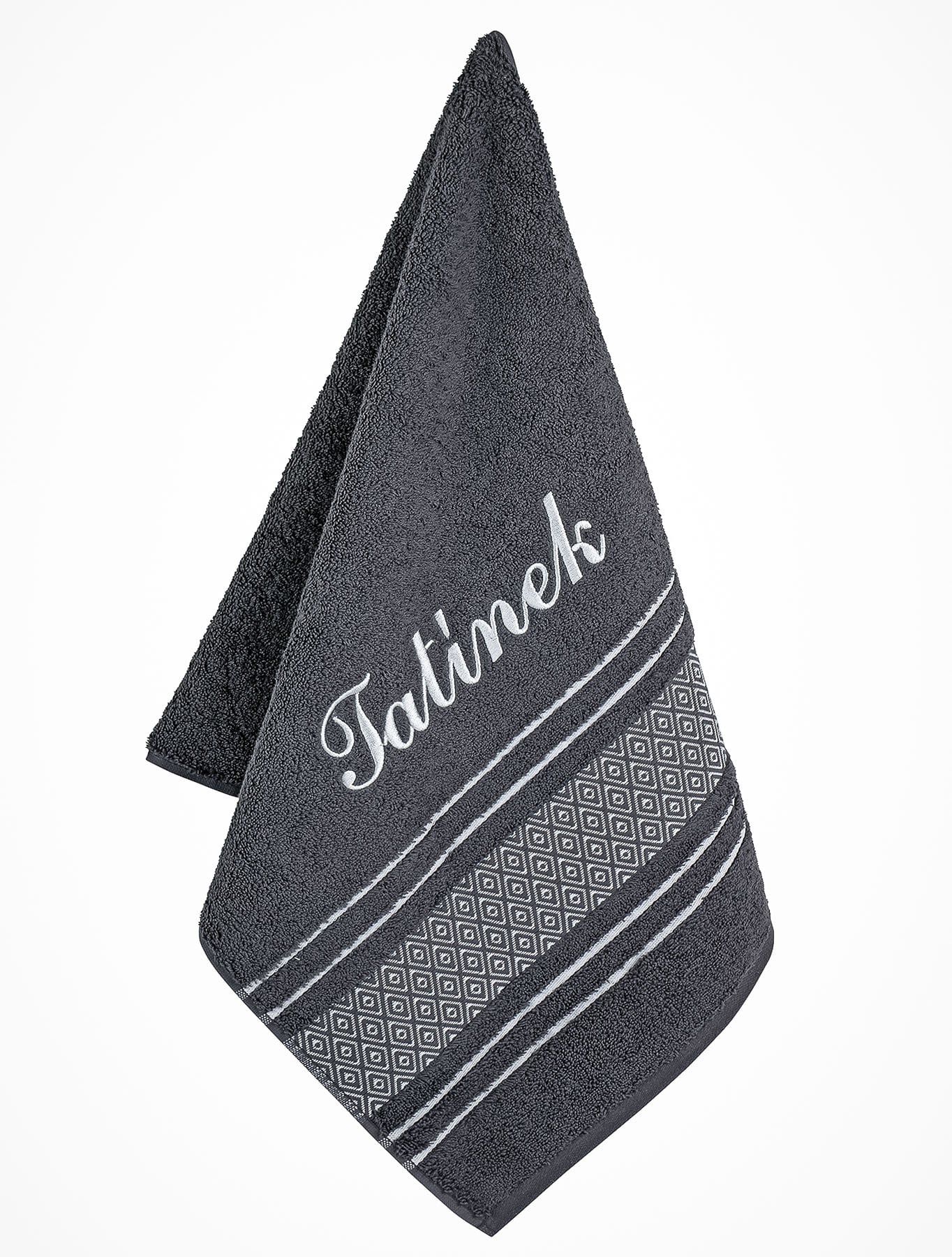 Froté ručník (50x100cm) v tmavě šedé barvě s výšivkou TATÍNEK s ozdobnými proužky s károvanými ornamenty. Ručníky a osušky jsou vyrobeny z vysoce kvalitní 100% bavlny s extra vysokou gramáží, díky čemuž jsou velmi měkké, vysoce savé a rychle schnoucí. Vyrobeny jsou v gramáži 550g/m2 a opatřeny praktickým poutkem na zavěšení. Ideální nejen jako dárek.Froté ručníky a osušky se stanou ozdobou každé koupelny. Osušky a ručníky jsou vyrobeny ze 100% bavlny s extra vysokou gramáží, díky čemuž jsou velice savé, hebké a rychle schnoucí. Udrží si vlastnosti a barevnou stálost i po mnoha vypráních. Osušky a ručníky doporučujeme prát na 60°C bez aviváže aby se dosáhlo stálé savosti. Žehlení max. 150°C.