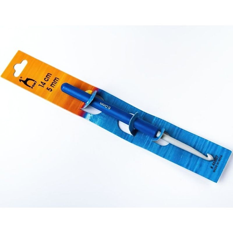Háček na háčkování hliníkový s plastovou rukojetí pro lepší uchopení v délce 14 cm a velikostí 5 mm. Barva plastové ručky se může lišit. Doporučená velikost háčku je obvykle uvedena na obalu každé příze.