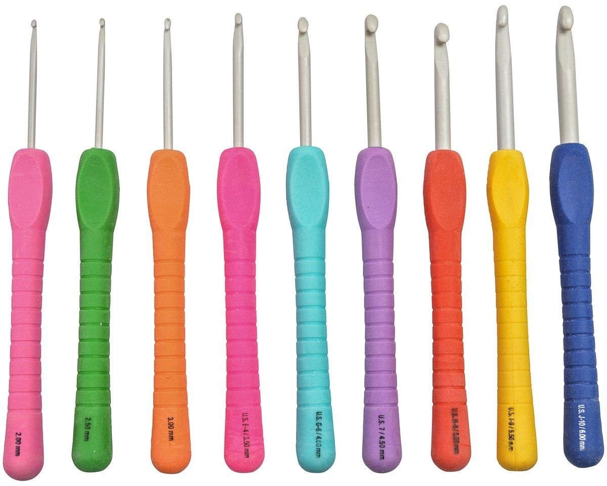 Sada hliníkových háčků na háčkování s pogumovanou rukojetí pro lepší uchopení v délce 14 cm. Souprava obsahuje 5 háčků o velikostech 2.00, 2.50, 3.00, 3.50, 4.00, 4.50, 5.00, 5.50, 6.00 mm. Háčky jsou vyrobené ze speciálně upraveného hliníku (eloxovaný), díky tomu příze lépe klouže po povrchu. Háček s nejnižším číslem je nejslabší, s nejvyšším naopak nejsilnější. Doporučená velikost háčku je obvykle uvedena na obalu každé příze.