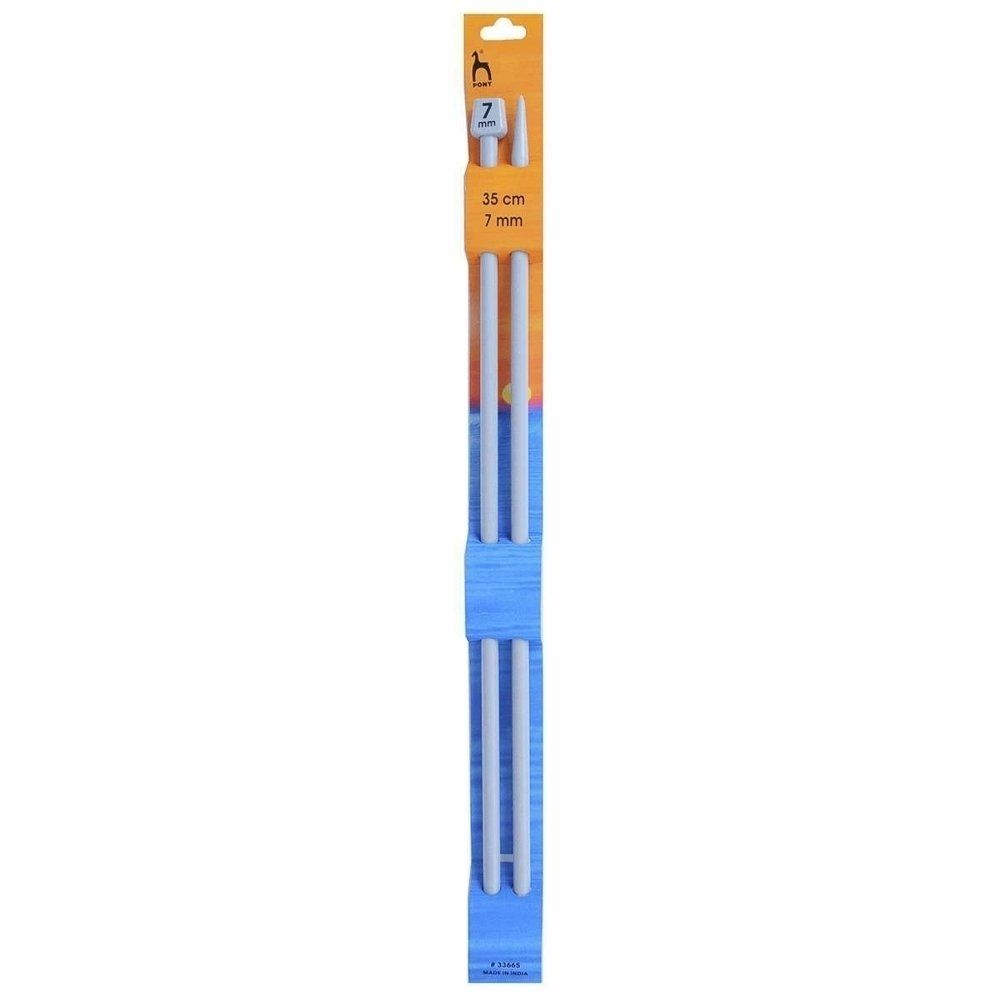 Pletací jehlice jsou vyrobeny z pevného hliníku se speciální povrchovou úpravou zaručující dlouhou životnost. Jehlice jsou rovné v délce 35cm a velikosti 7mm. Balení obsahuje 2 kusy (1 pár) jehlic.