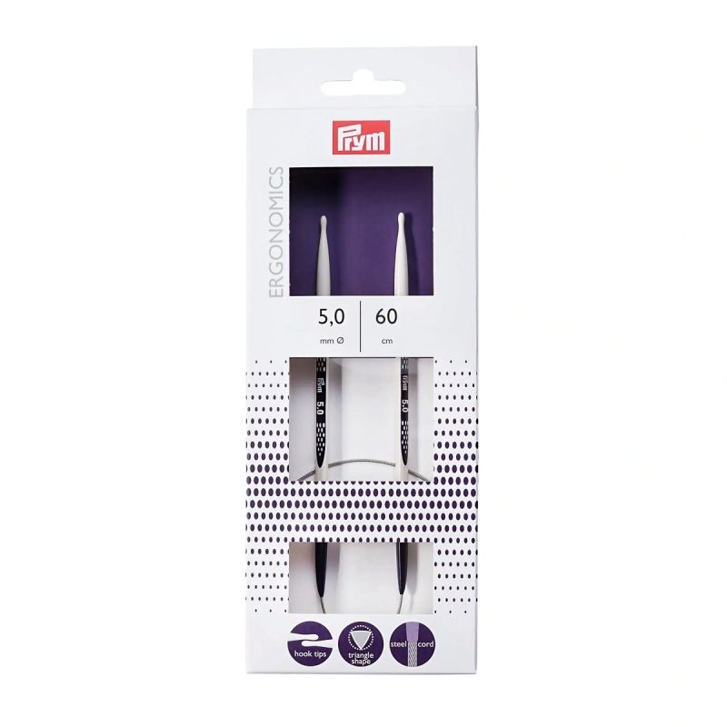 Revoluční pletací jehlice z vysoce funkčního syntetického materiálu německé firmy PRYM. Jehlice jsou ergonomické, velmi lehké a nehlučné. Špička ve tvaru kapky umožňuje jednodušší zachycení příze a hladké vedení jednotlivých ok, které je podpořeno i trojúhelníkovým profilem jehlice. Kruhové jehlice jsou spojeny ocelovým lankem potaženým plastem v délce 60cm a velikosti 5mm, které je pevné, ale zároveň i jemné a poddajné. Balení obsahuje 1 kus jehlic.