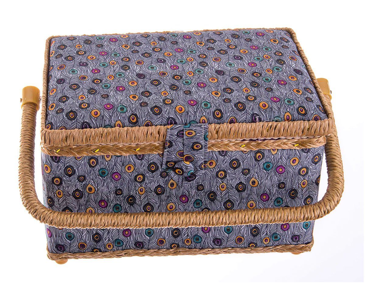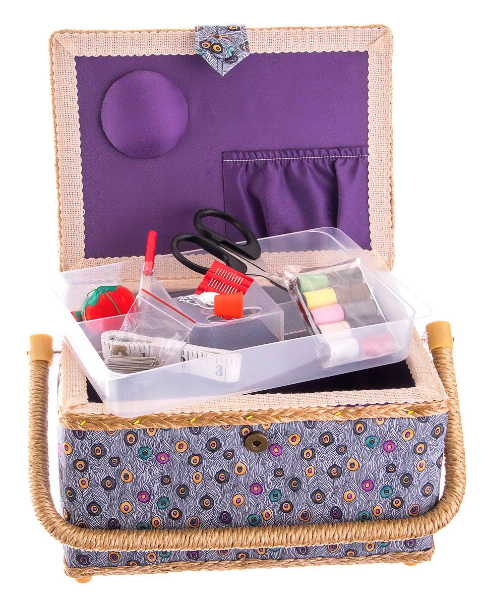 Čalouněná kazeta na uložení šících potřeb se vzorem pavích per na fialovém podkladu. Box má částečnou základní výbavu. Dále však košík na šití pojme nůžky, jehly, špendlíky, nitě, metry a další krejčovské potřeby. Vnitřek obsahuje odnímatelné patro z pevného plastu, které má dvě menší přihrádky a jednu větší. Na vnitřní straně víka se nachází praktický jehelníček. Šitíčko je vyrobeno v kombinaci plastu s textilním víkem a boky. Rozměry košíku jsou 24 cm x 17,5 cm a výška činí 13 cm.