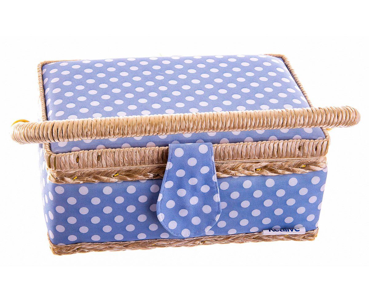 Čalouněná kazeta na uložení šících potřeb se vzorem bílého puntíku na modrém podkladu. Košík na šití pojme nůžky, jehly, špendlíky, nitě, metry a další krejčovské potřeby. Vnitřek obsahuje odnímatelné patro z pevného plastu, které má dvě menší přihrádky a jednu větší. Na vnitřní straně víka se nachází praktický jehelníček. Šitíčko je vyrobeno v kombinaci plastu s textilním víkem a boky. Rozměry košíku jsou 19 cm x 13 cm a výška činí 10 cm.
