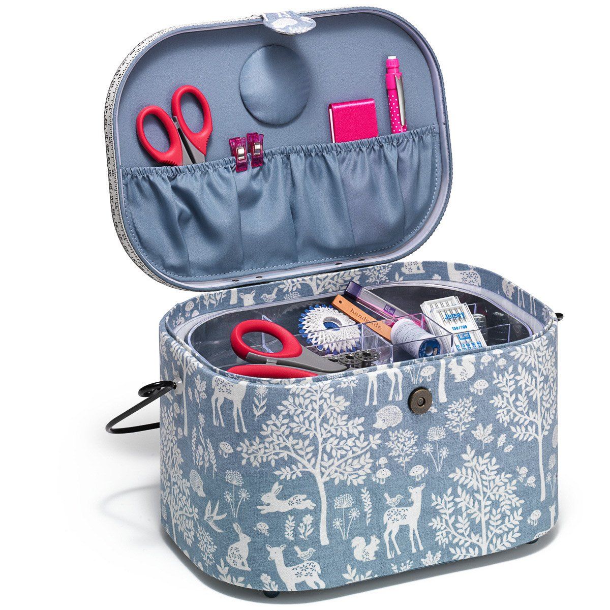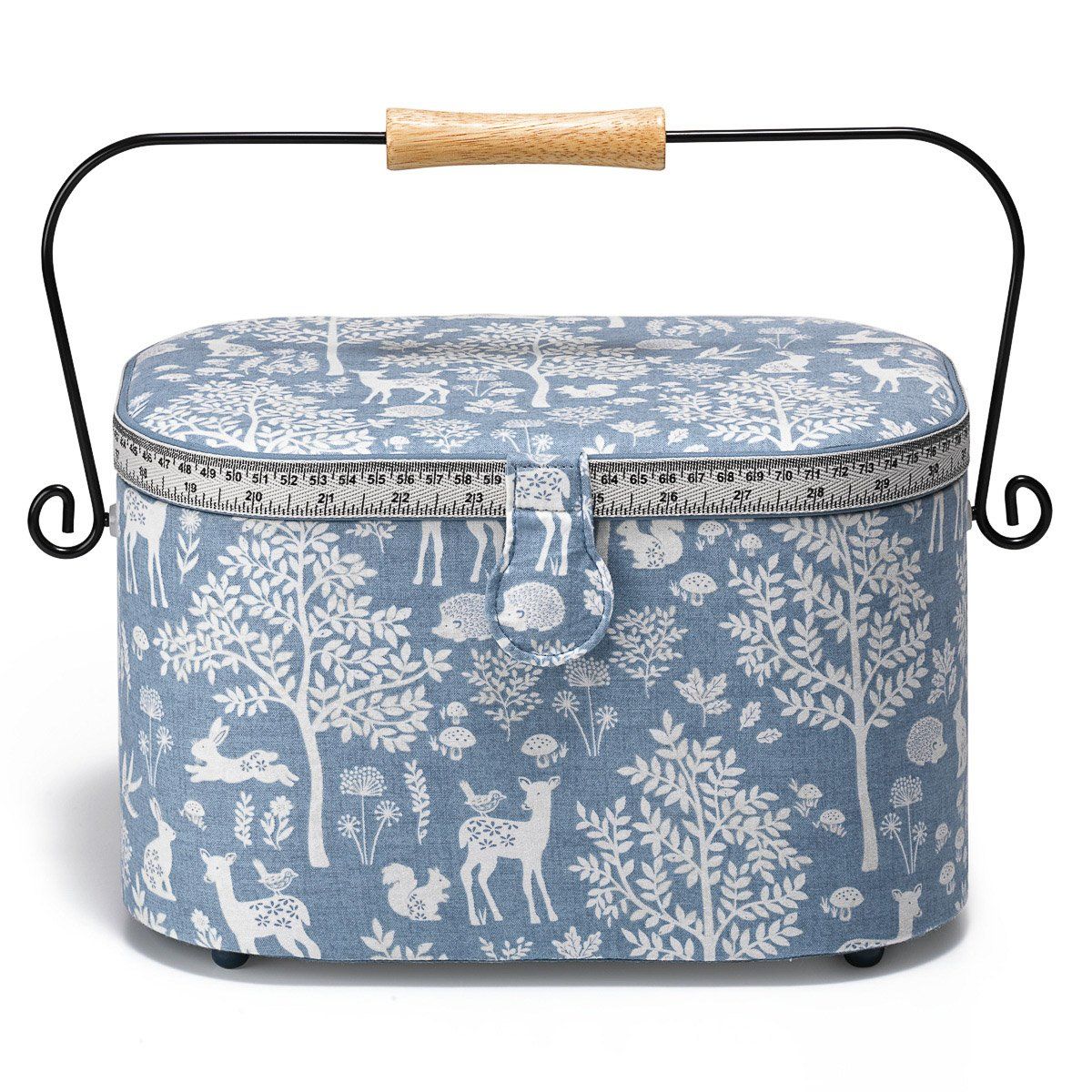 Čalouněná kazeta na uložení šicích potřeb v modré barvě s lesním motivem. Košík na šití pojme nůžky, jehly, špendlíky, nitě, metry a další krejčovské potřeby. Vnitřek obsahuje odnímatelné patro z pevného plastu, které má dvě menší přihrádky a jednu větší. Na vnitřní straně víka se nachází praktický jehelníček. Šitíčko je vyrobeno v kombinaci plastu s textilním víkem a boky. Rozměry košíku jsou 30 cm x 20 cm a výška činí 19 cm.