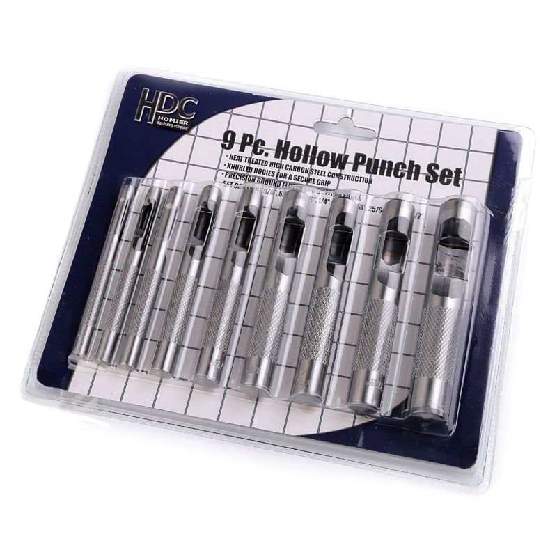 Sada kruhových výsečníků / děrovačů, kterou využijete k děrování kůže a látek. Při vysekávání materiálu doporučujeme pracovat na tvrdé podložce a podkladu, který nepruží. Využití při práci s kůží, výroba tašek, kabelek či peněženek, nutno použít kadívko. Sada obsahuje 9 kusů a průměr výsečníků je 3; 4; 5; 6; 8; 9; 10; 11; 12 mm, délka 8,5 - 10 cm.