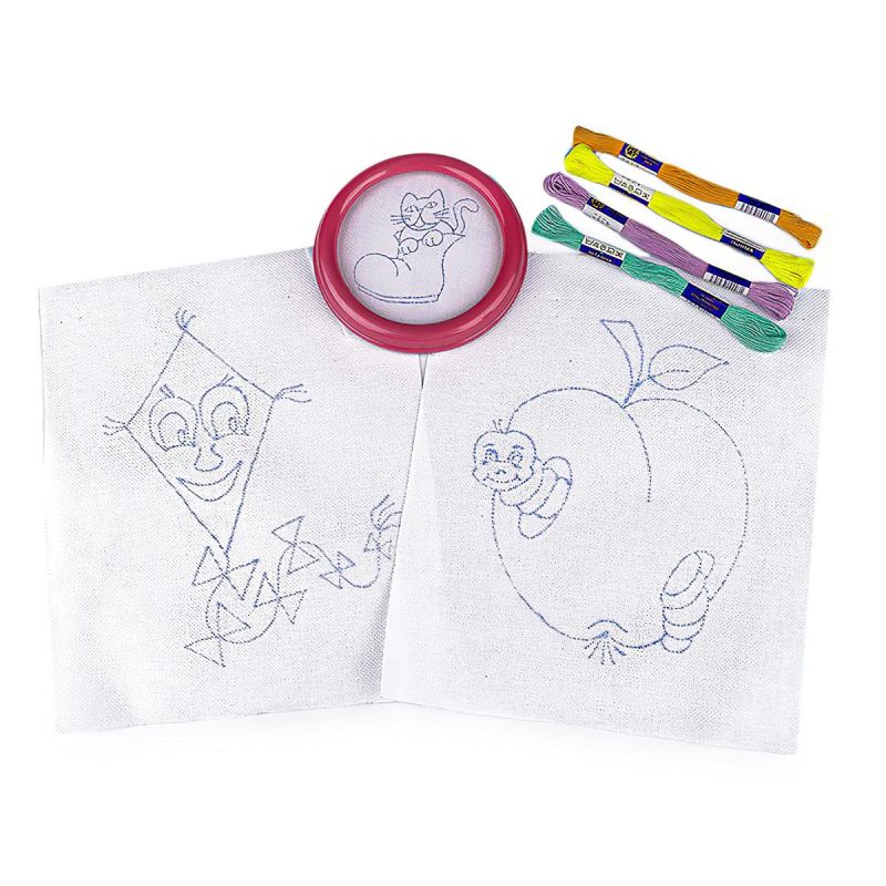 Dětská sada na vyšívání s motivem draka a jablka. Vyšívá se na předtištěnou tkaninu pomocí vyšívacích jehel a přízí mouline (mulinka). Vyšívací sada obsahuje vyšívací tkaninu s předlohou, sadu barevných přízí a kulatý plastový rámeček o průměru 12 cm (vnitřní průměr 9,3 cm) a dvě větší plátna ze 100...