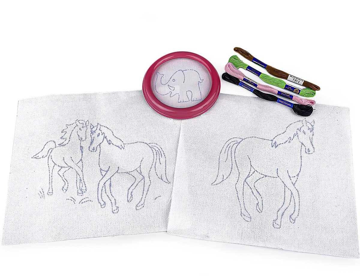 Dětská sada na vyšívání s motivem koní. Vyšívá se na předtištěnou tkaninu pomocí vyšívacích jehel a přízí mouline (mulinka). Vyšívací sada obsahuje vyšívací tkaninu s předlohou, sadu barevných přízí a kulatý plastový rámeček o průměru 12 cm (vnitřní průměr 9,3 cm) a dvě větší plátna ze 100% bavlny o rozměru 23 x 26 cm s předtištěnými motivy.